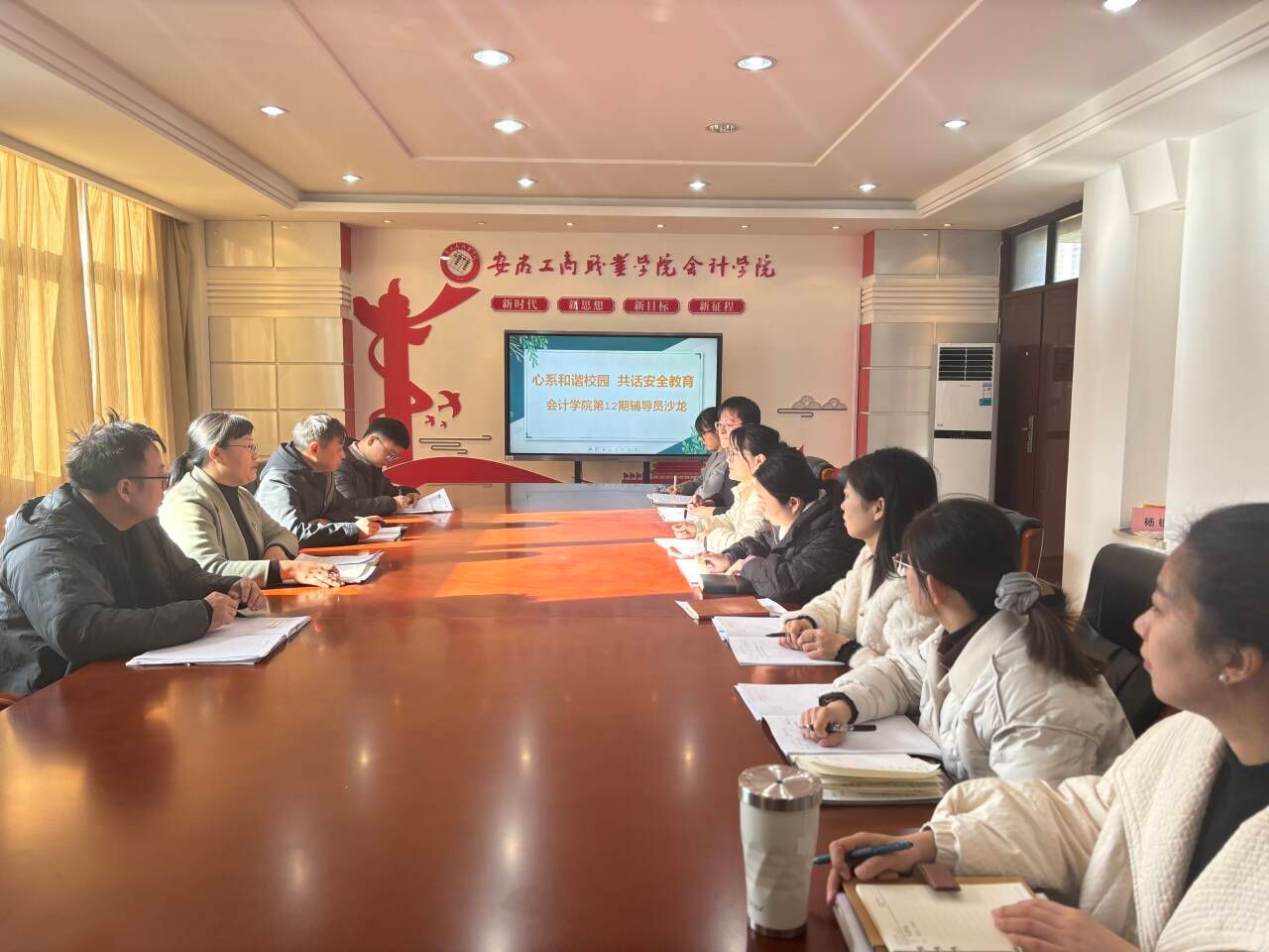 为深入贯彻落实党的二十大精神,全面实施立德树人根本任务,进一步提升辅导员在意识形态领域的专业能力,推动辅导员队伍向专业化、职业化方向发展,确保学院思想政治工作质量得到切实提升。会计学院于2024年11月28日上午,在明德楼二楼党建会议室举行了以“心系和谐校园 共话安全教育”为主题的第12期辅导员沙龙活动。本次活动由党总支书记赵艳主持,党总支副书记李峰与全体专职辅导员参与。