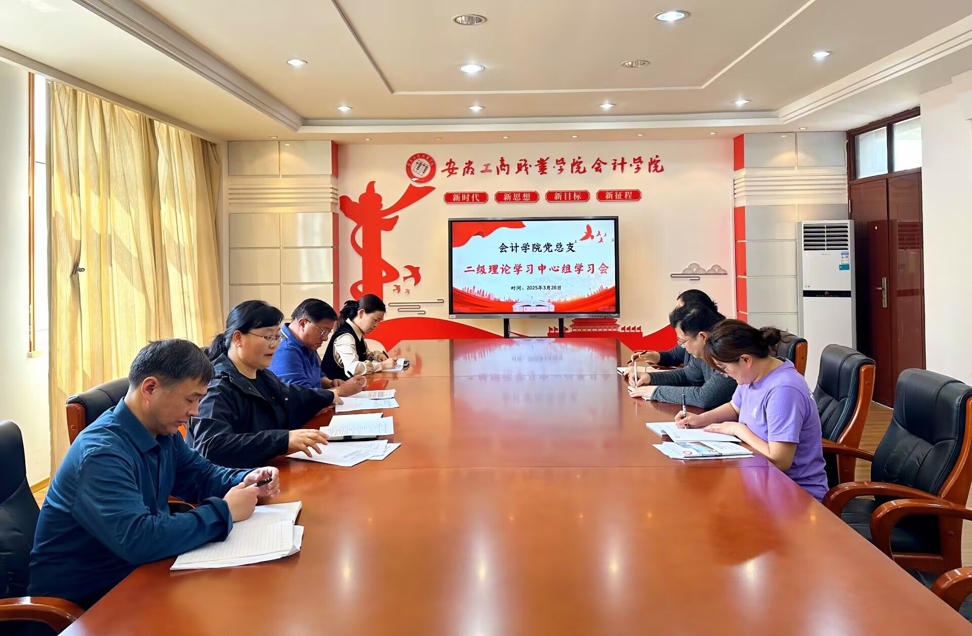 3月26日中午,会计学院党总支在明德楼二楼党建会议室召开理论学习中心组学习会,深入学习贯彻习近平总书记系列重要讲话和重要指示精神,专题学习全国两会精神。学院党总支委员参会,会议由党总支书记赵艳主持。