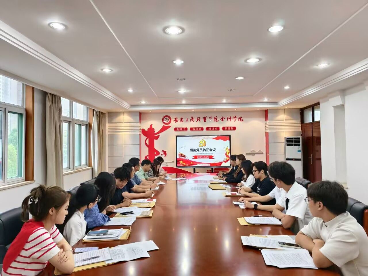 2025 年 6 月 26 日,会计学院学生第一、第二、第三、第四党支部分别在明德楼党建会议室及二号会议室召开预备党员转正大会。各党支部书记主持会议,各支部正式党员与预备党员参会。