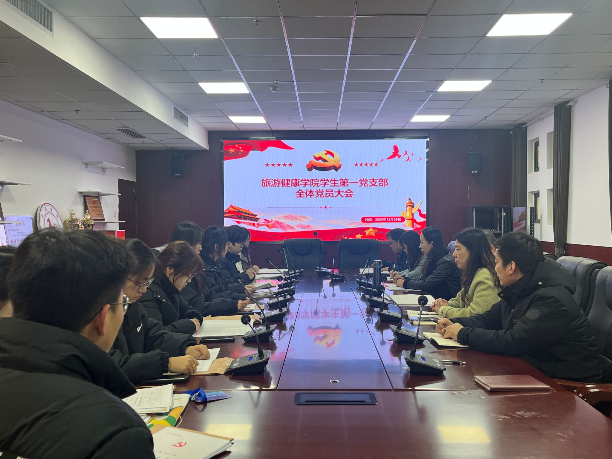 2023年12月29日中午,旅游健康学院学生第一党支部在学院三楼会议室召开全体党员大会讨论关于接收耿思琴等9名同学为预备党员事宜。学院党总支书记杨锐到会指导,会议由支部书记张亚运主持。