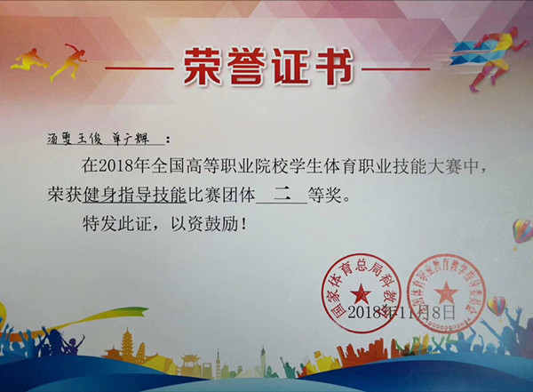 学生专业技能强,共获得全国职业院校技能大赛高职组健身指导比赛二等奖1项,全国高等体育职业教育学生技能大赛健身指导技能比赛二等奖2项,安徽省职业院校技能大赛高职组健身技能比赛一等奖3项,二等奖3项,安徽省体育行业职业技能大赛健身项目二等奖1项,三等奖2项。