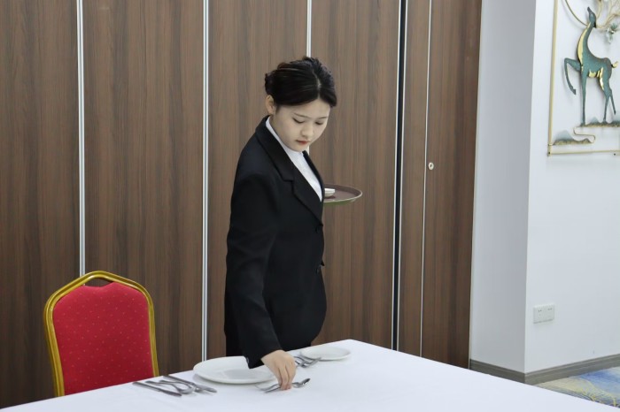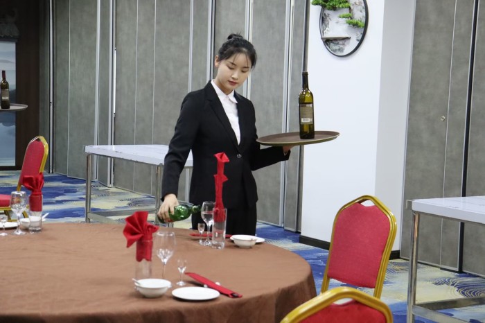 为了提高我院酒店管理与数字化运营专业技术技能人才培养水平,以赛促教,充分发挥技能竞赛对教育教学的引领和评价水平,推动专业建设和教学改革深入发展,建立健全以竞争为导向的激励学习方式,4月26日中午,安徽工商职业学院餐厅服务技能大赛决赛在餐厅实训室隆重举行,旅游健康学院教务科长李晓维、酒店管理与数字化运营教研室主任李俊及相关专业教师担任比赛评委。