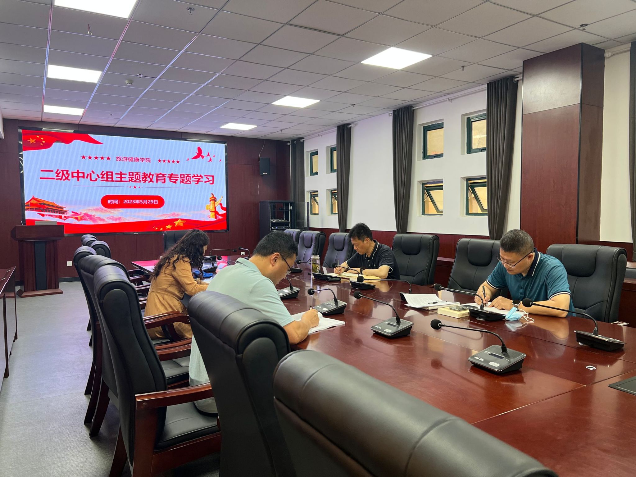 为深入推进学习贯彻习近平新时代中国特色社会主义思想主题教育,5月29日上午,旅游健康学院党总支在学院会议室召开了二级中心组学习,会议由旅游健康学院党总支书记杨锐主持,二级中心组全体成员参加了会议。