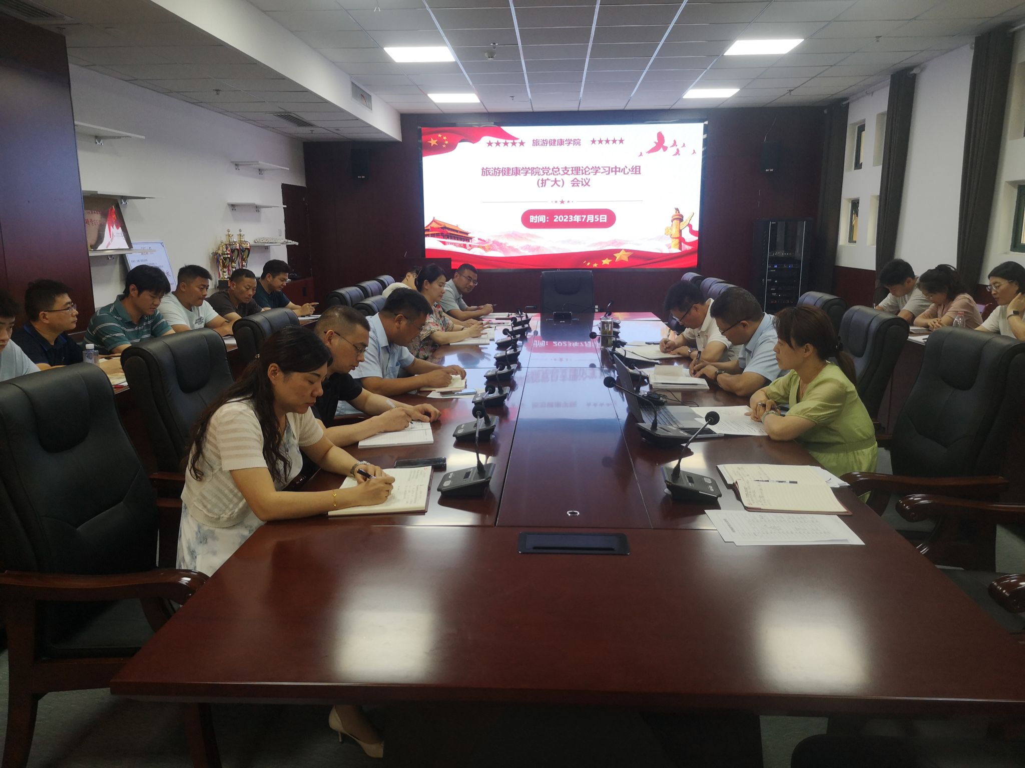 7月5日下午,旅游健康学院党总支在学院会议室开展二级中心组(扩大)学习暨教职工政治理论学习;学院二级中心组成员、全体在岗教职工参加学习,会议由党总支书记杨锐主持。