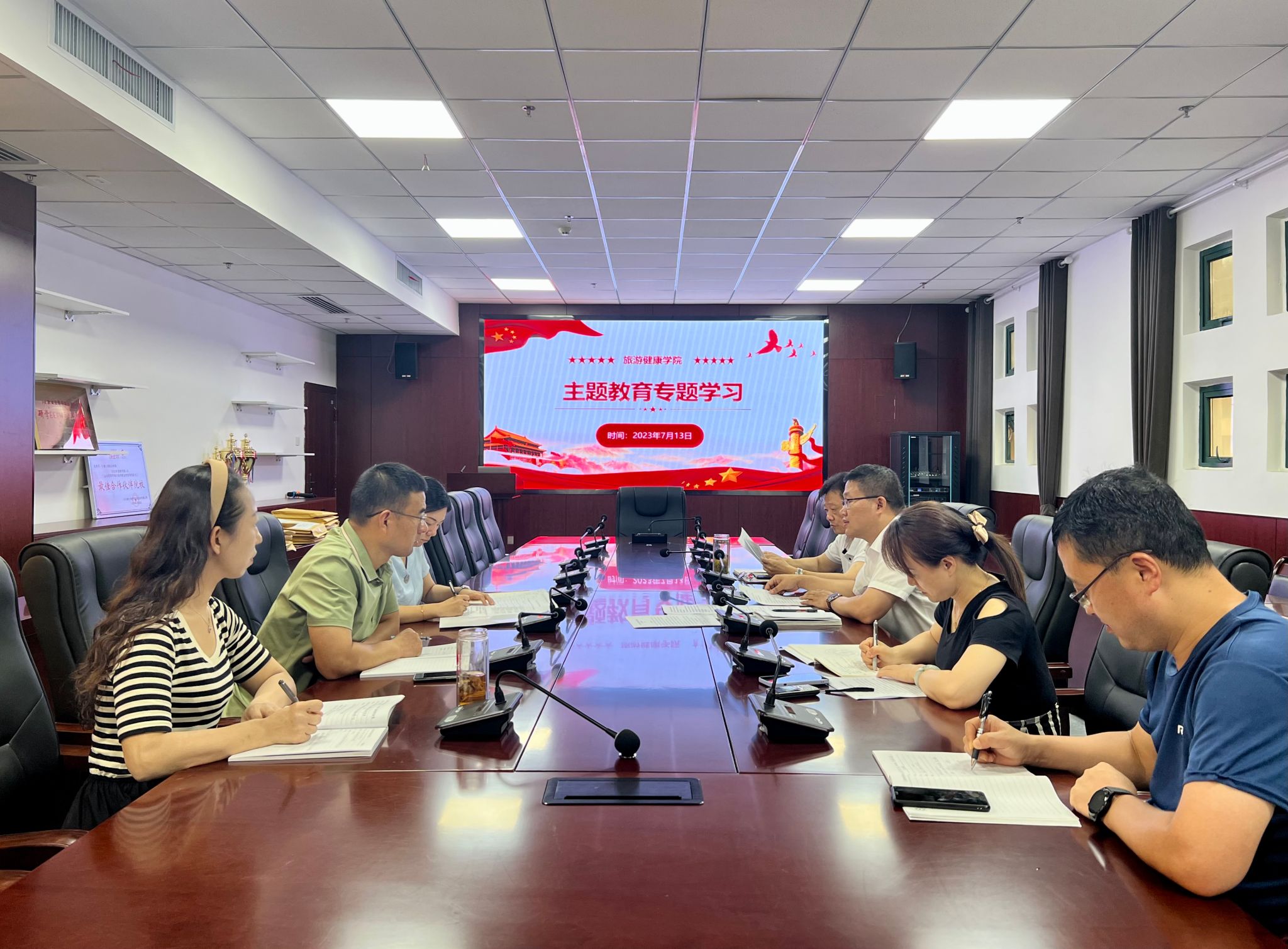 为深入开展学习贯彻习近平新时代中国特色社会主义思想主题教育,7月13日下午,旅游健康学院党总支组织开展二级中心组学习,全体总支委员参加学习,会议由党总支书记杨锐主持。