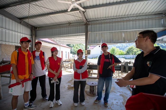 此外,实践团队还前往村毛竹加工厂、木耳种植基地参观调研,在这片群山环绕的土地上,当地村民立足资源环境优势,做大做强毛竹产业,流转竹园近3000亩,加快毛竹初加工向精深加工发展。在木耳种植基地,一个个菌棒整齐排列,夏季是木耳培育养护的重要时节,同学们在培育温室间里详细询问工作人员木耳种植的情况。