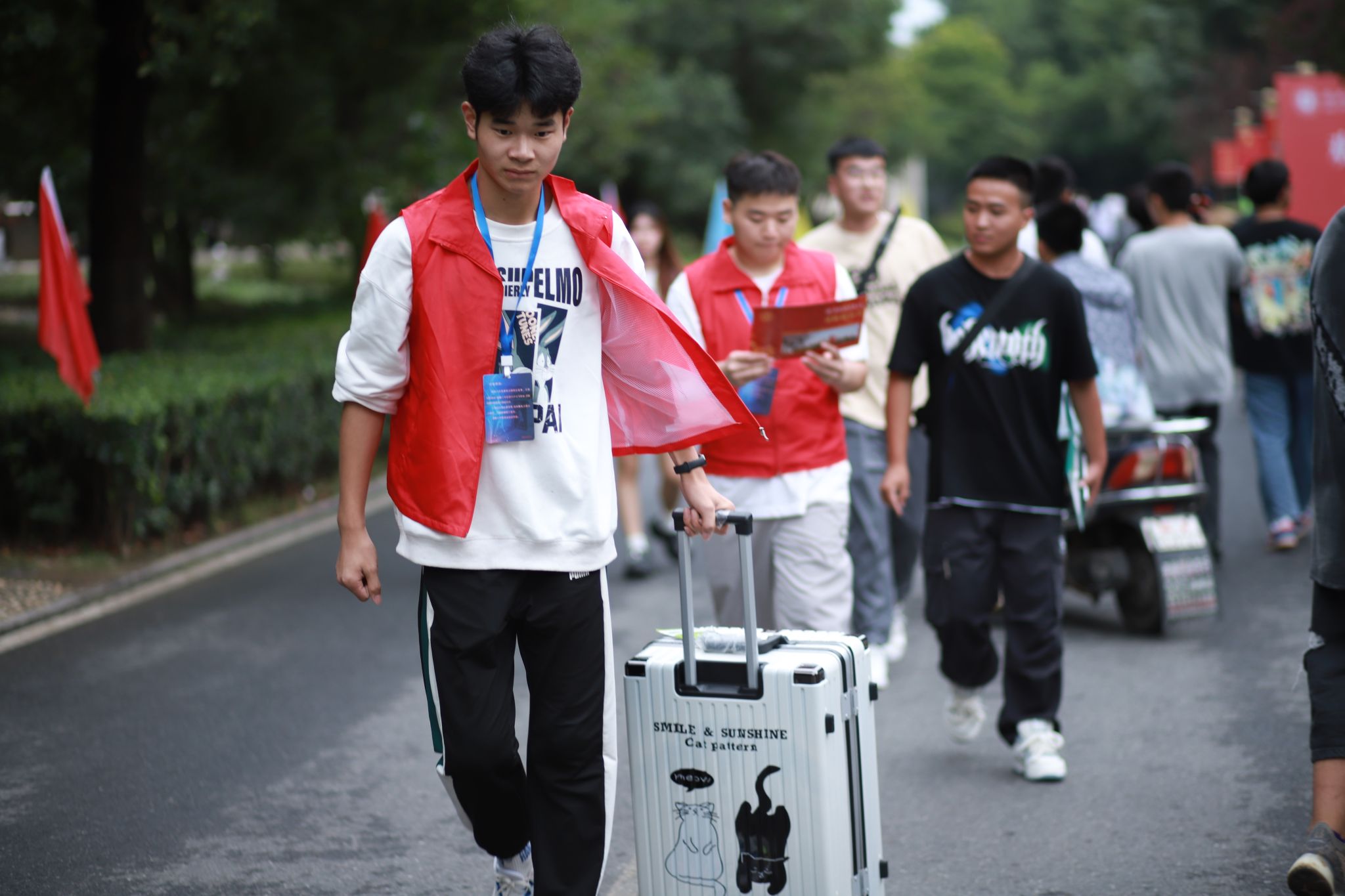“同学,你好,欢迎来到旅游健康学院!”、“我们带你们去办理入住手续!” ……一群群新的面孔出现在校园里,一个个红色“小马甲”穿梭在学校中,旅游健康学院的志愿者们以饱满的热情迎接新生、积极协助新生搬运行李,为新生答疑解惑。9月13日—14日,旅游健康学院638名 2023级新生如约踏入大学校园。迎新过程中,全院上下一盘棋,学院领导、老师、全体辅导员通力协作,各司其职,报到现场环境布置、报到引导、秩序维护、手续办理、行李搬运、寝室入住等流程顺畅快捷,迎新过程秩序井然,得到了新生和家长的一致认可。