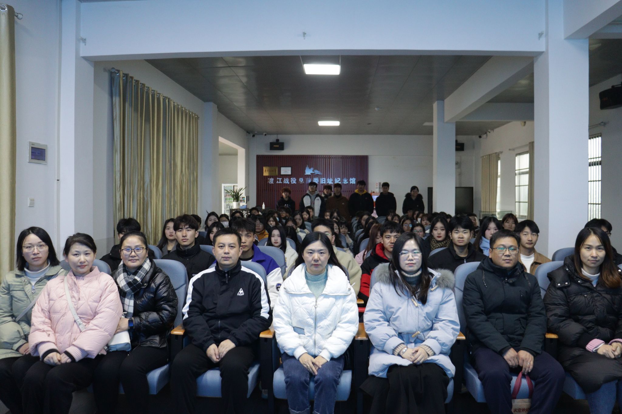 在总前委旧址纪念馆放映厅,全体师生观看了渡江战役专题宣传教育片,回顾渡江战役的历史进程,深入了解总前委在瑶岗运筹帷幄的恢宏历程,感受革命先辈坚定不移的革命意志、伟大的斗争精神和卓越的革命智慧。