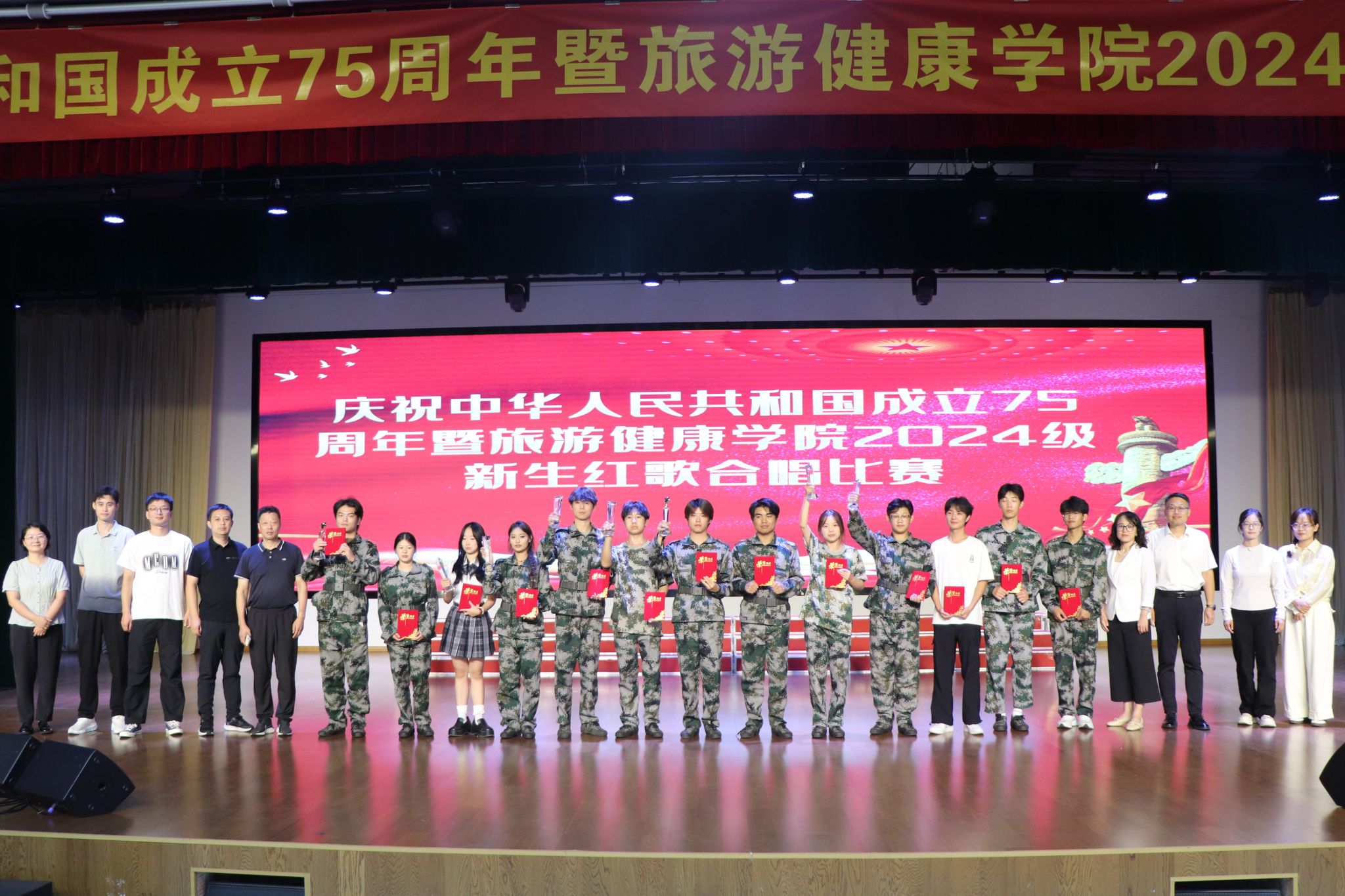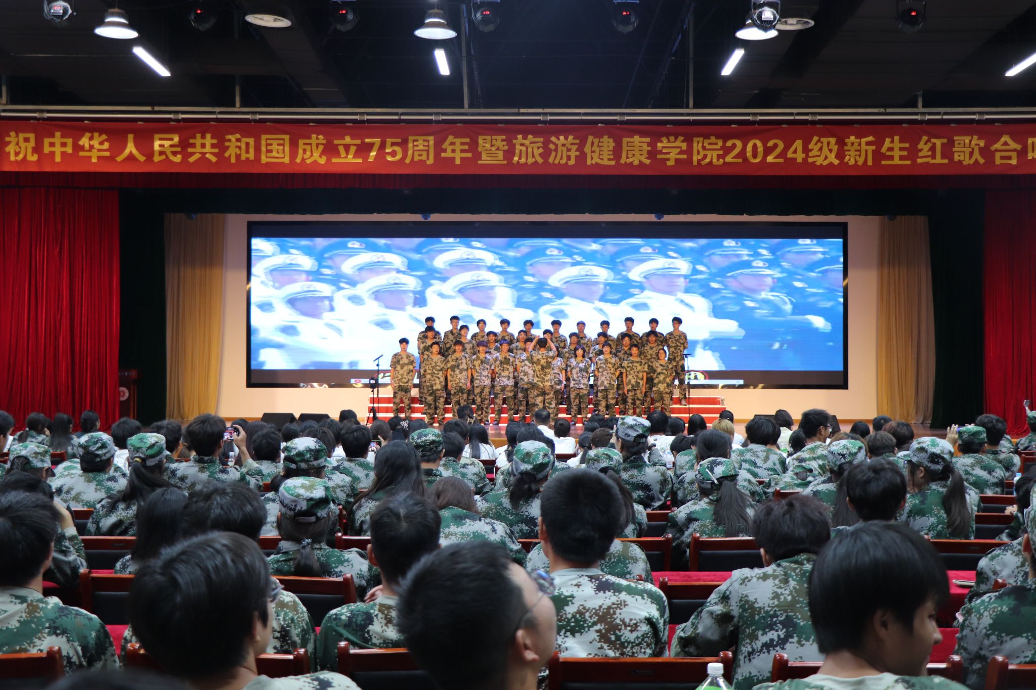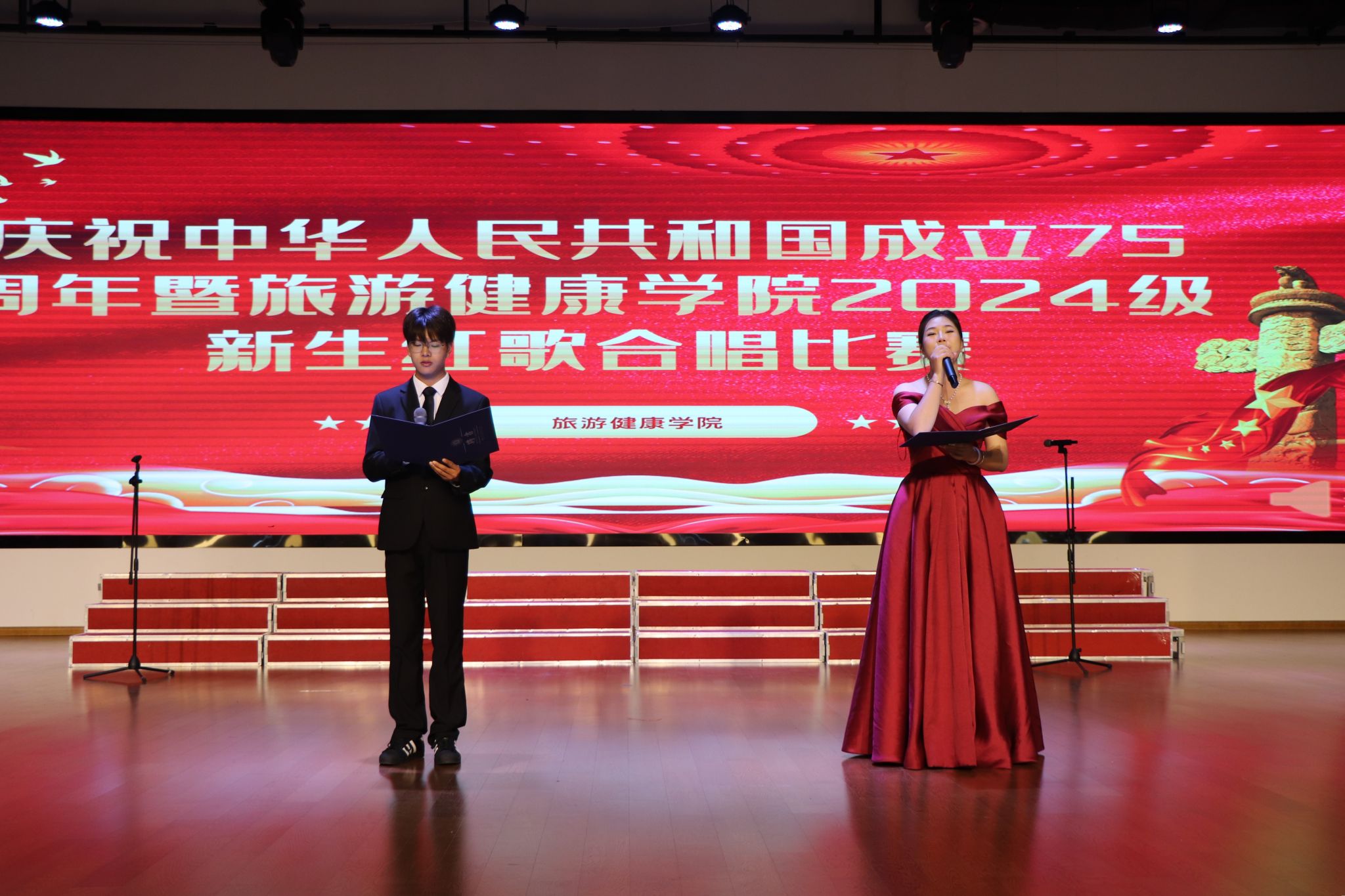 为隆重庆祝中华人民共和国成立75周年,讴歌新中国75年波澜壮阔的光辉历程和伟大历史成就,大力弘扬以爱国主义为核心的民族精神和以改革创新为核心的时代精神,激发广大师生爱党爱国爱校的炽热情怀,9月29日中午,旅游健康学院在双凤校区大学生活动中心举行了庆祝中华人民共和国成立75周年暨2024级新生红歌合唱比赛。