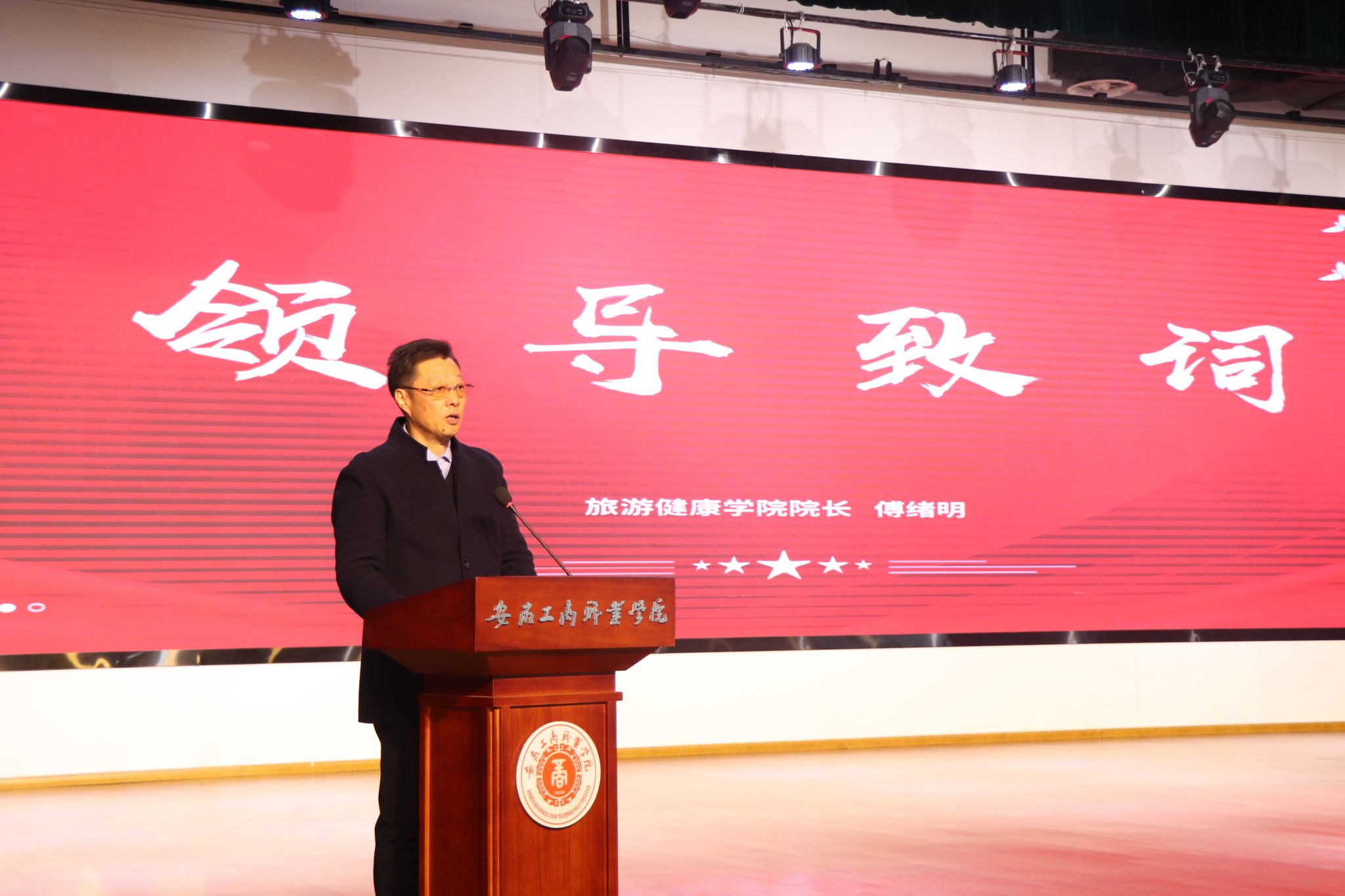 活动共分为三个篇章,第一篇章是学习榜样、青春引航。首先播放了活动宣传视频《最好的榜样》,视频中,从图书馆到实训室,从课桌旁到绿茵场,同学们用各自的方式勤奋学习,努力奋斗,让现场师生深受震撼。随后,旅游健康学院院长傅绪明为本次活动致词,他表示获得优秀荣誉的同学们勇担时代使命,在勤学中探索、在实践中 磨砺、在挑战中成长,彰显了新时代大学生踔厉奋发的青春风采和奋斗精神,他们是我们身边的榜样,也是我们前行的力量。他希望同学们要涵育理想,志存高远,肩负时代使命;要锤炼本领,脚踏实地,争做时代新人;勇毅担当,躬身实践,扎根时代沃土。他勉励广大同学要坚定不移听党话、跟党走,怀抱梦想又脚踏实地,敢想敢为又善作善成,立志做有理想、敢担当、能吃苦、肯奋斗的新时代好青年,让青春在全面建设社会主义现代化国家的火热实践中绽放绚丽之花。