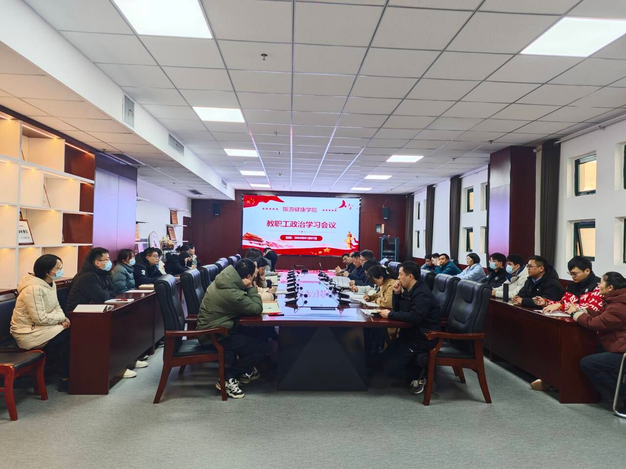 1月7日中午,旅游健康学院党总支在学院会议室召开二级理论学习中心组(扩大)会议暨教职工政治理论学习,会议由党总支书记杨锐主持,全体教职工参加会议。