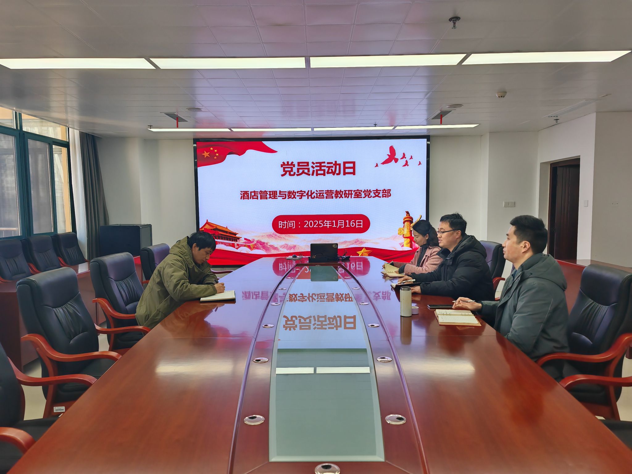 2025 年 1 月 16 日,旅游健康学院酒店管理与数字化运营教研室党支部在综合楼第四会议室举行党员活动日学习活动,全体党员参加学习,活动由支部书记王彦龙主持,校党委委员、纪委书记吴松飞以普通党员身份参加学习。