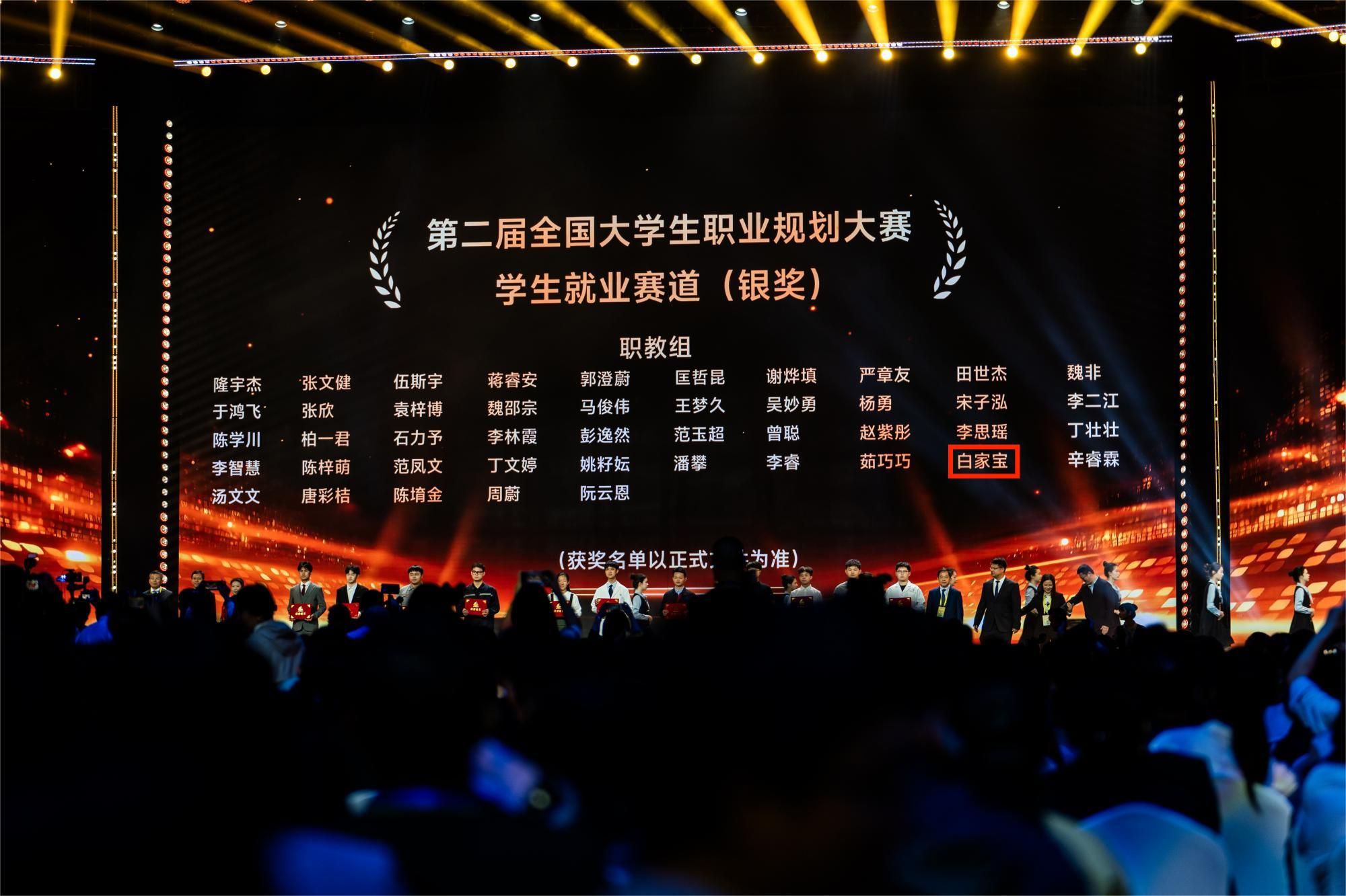 4月16日至19日,第二届全国大学生职业规划大赛全国总决赛在湖南省长沙市成功举办,本届大赛由教育部、湖南省人民政府共同主办,中南大学、湖南大学、湖南师范大学三所高校承办。比赛采用校赛、省赛、全国总决赛三级赛制,面向中低年级学生设成长赛道,面向高年级学生设就业赛道。大赛累计报名学生1507万人,覆盖高校2763所,共计750余名大学生晋级全国总决赛。我校旅游健康学院学生白家宝入围国赛,经过激烈角逐,斩获就业赛道(职教组)银奖。