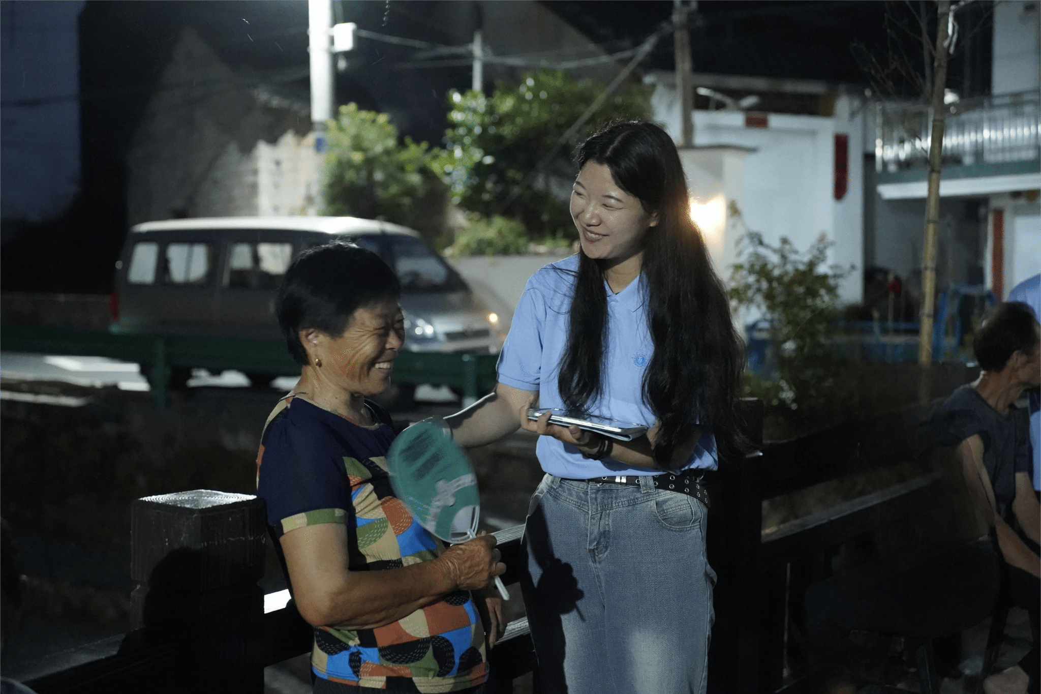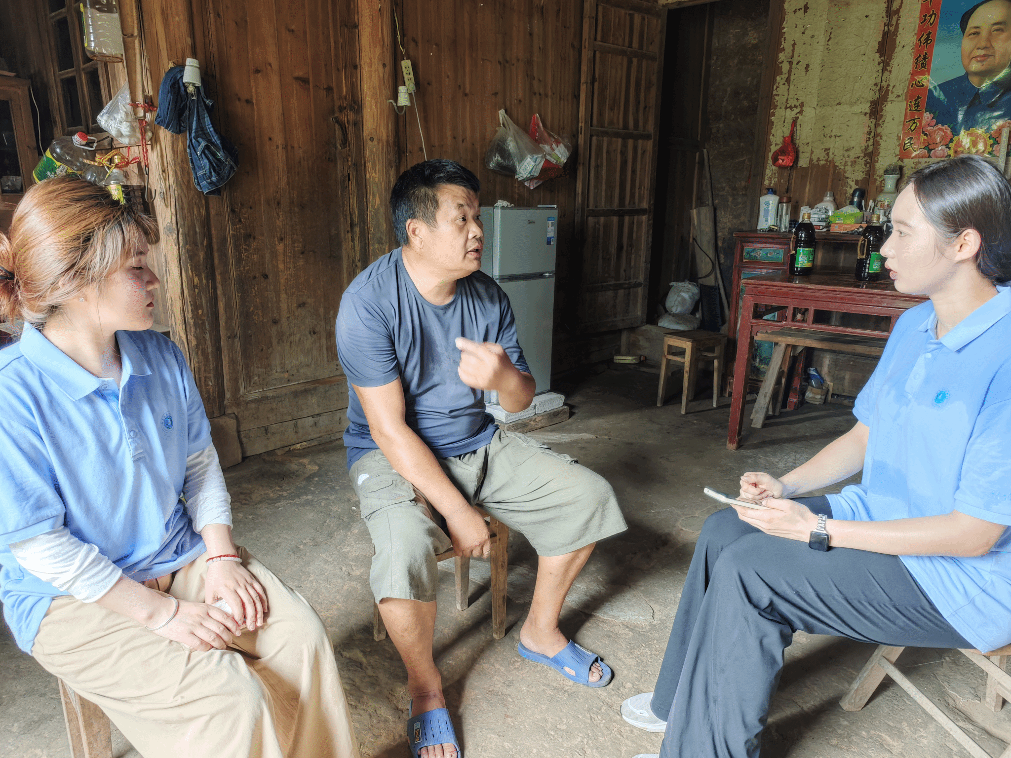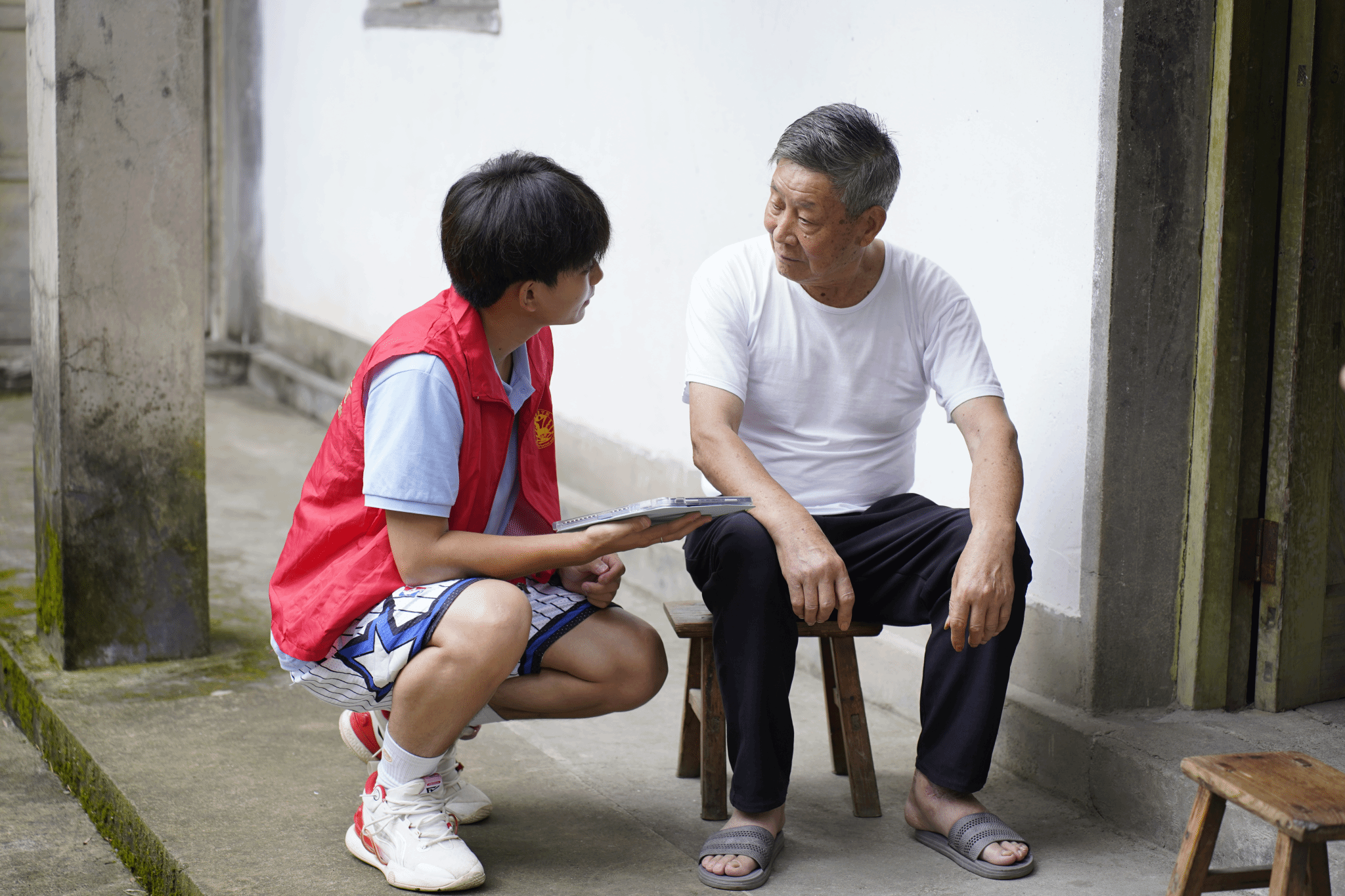 社会实践期间,团队还开展一系列丰富多彩的志愿服务活动。在村干部的带领下,团队深入山林腹地看望困难村民,并给他们送去了爱心物资,志愿者与他们聊起家常,热情地询问身体状况、生活情况。团队还专门开展了“给老人拍张照”志愿活动。快门按下,一张张饱经风霜的笑脸和一双双充满故事的双眼就此定格,同学们将打印好的照片送到老人手上,温情跃然纸上。
