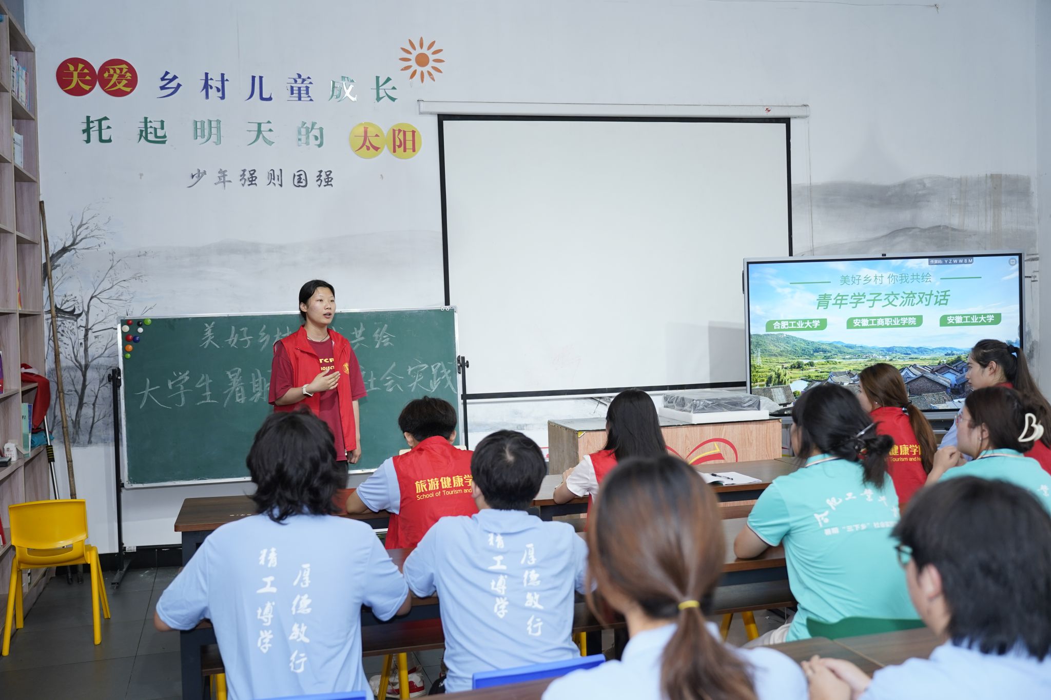 为深化实践育人成效,凝聚青年学子投身乡村振兴的智慧与力量,7月10日下午,安徽工商职业学院旅游健康学院暑期三下乡社会实践团队联合合肥工业大学、安徽工业大学社会实践团队,在黄山市休宁县源芳乡渔临村共同举办“青年学子成长交流对话”活动。三校指导教师及实践团队成员共30余人参与活动,大家围绕非遗保护、乡村教育、青春担当等主题展开深度对话,共绘乡村振兴青春画卷。
