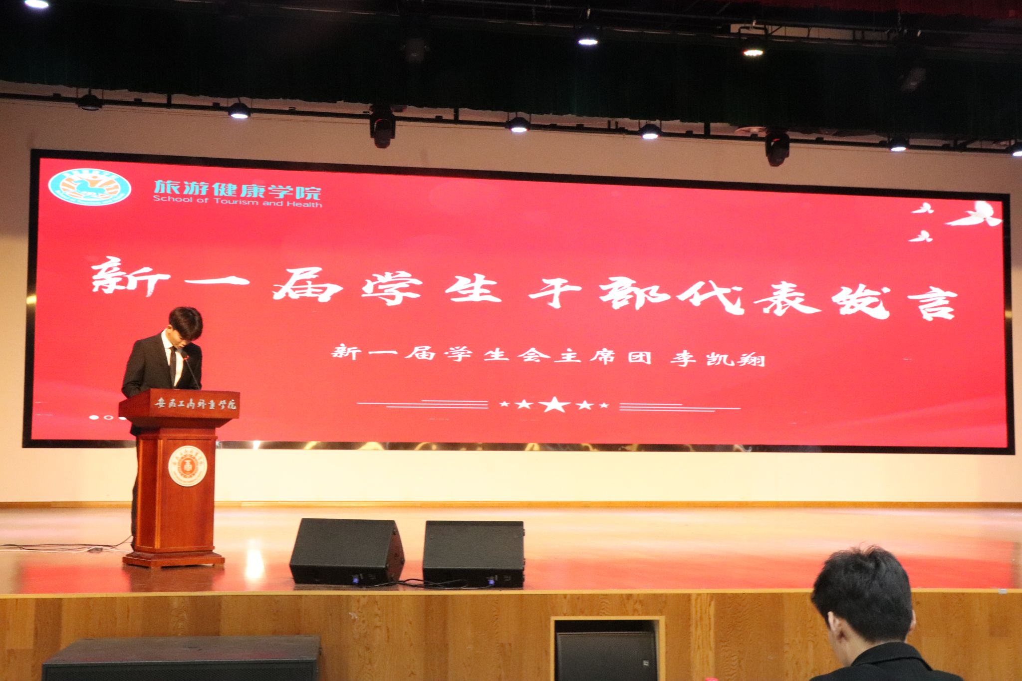 11月12日中午,旅游健康学院在大学生活动中心召开2025年度团学组织换届表彰大会,总结过去一年团学工作成果,表彰先进集体与个人,并完成新一届团学组织骨干的聘任仪式。旅游健康学院党总支书记杨锐、组织员张程程、办公室主任孙群以及团学组织指导老师和辅导员代表出席大会。