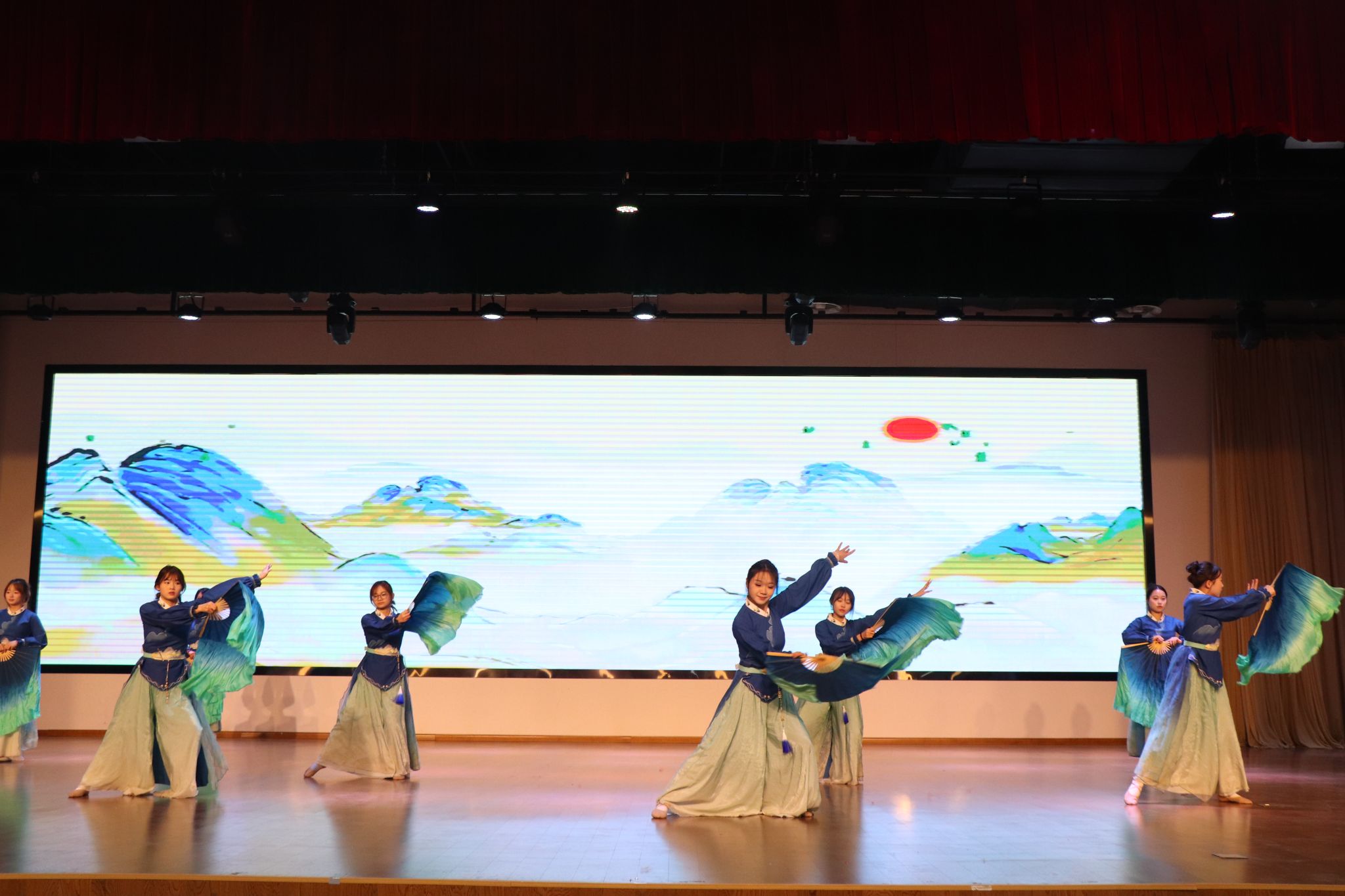 一卷青绿,绘尽山河锦绣;一舞千年,跃动天地诗行。古典舞蹈《千里江山图》以北宋王希孟的绝世长卷名画为灵感,通过“层峦叠嶂”“流水行云”等队形变化,将二维画卷转化为三维立体诗篇,同学们身着青绿长裙,用肢体语言诠释了“咫尺有千里之趣”的东方美学。