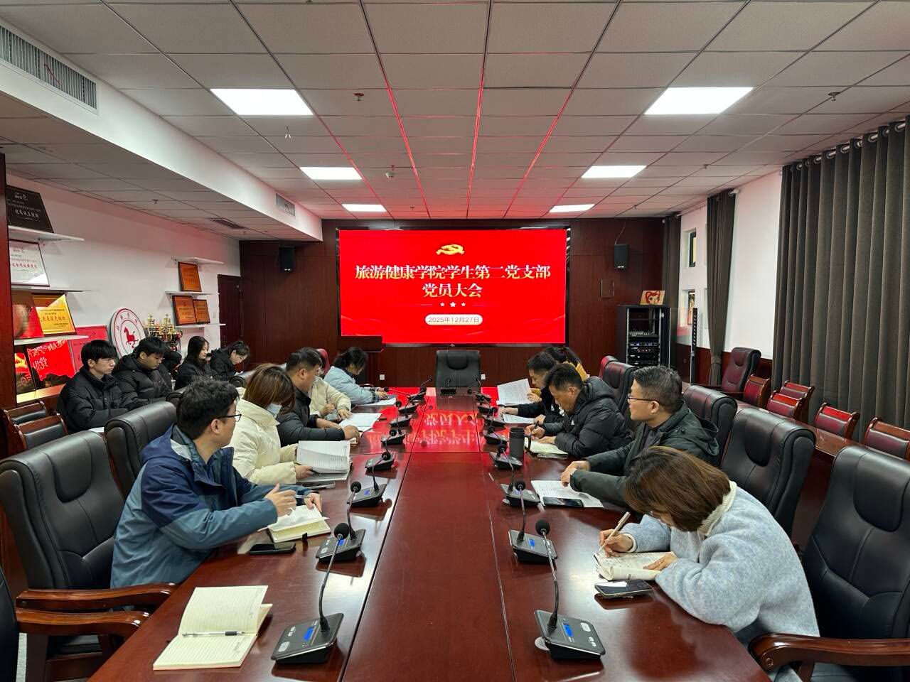12月27日中午,旅游健康学院学生第二党支部在学院会议室召开支部党员大会,审议谭雨婷等5名预备党员转正事宜,会议由支部书记孙群主持,旅游健康学院党总支书记杨锐到会指导。