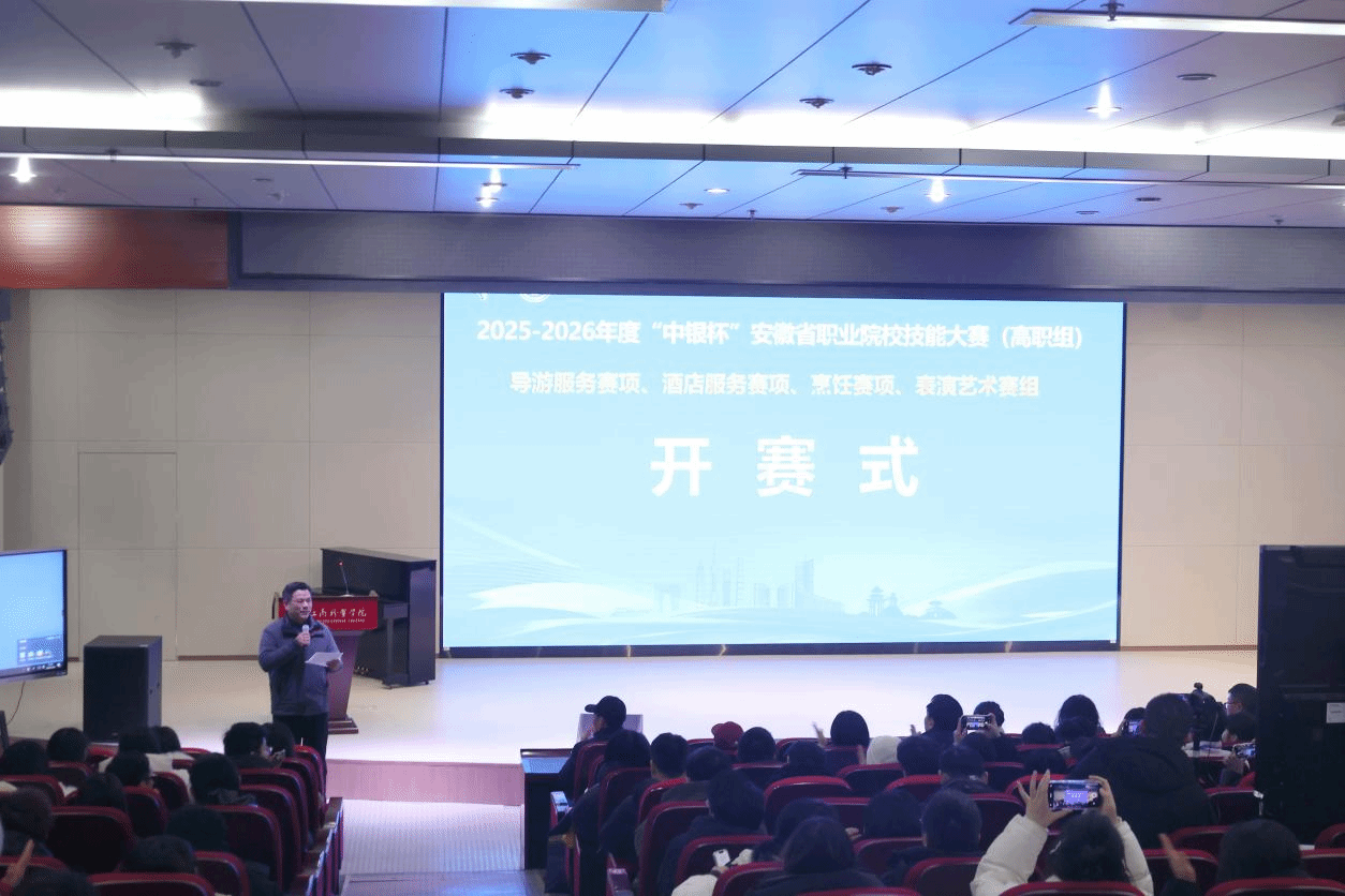 1月20日下午,2025-2026年度“中银杯”安徽省职业院校技能大赛(高职组)导游服务、酒店服务、烹饪赛项及综合赛道表演艺术赛组开赛式,在安徽工商职业学院双凤校区举行。本届赛事汇聚了全省职业院校96支代表队、近500名师生代表,共同参与这场展示职业教育成果、弘扬工匠精神的年度盛会。