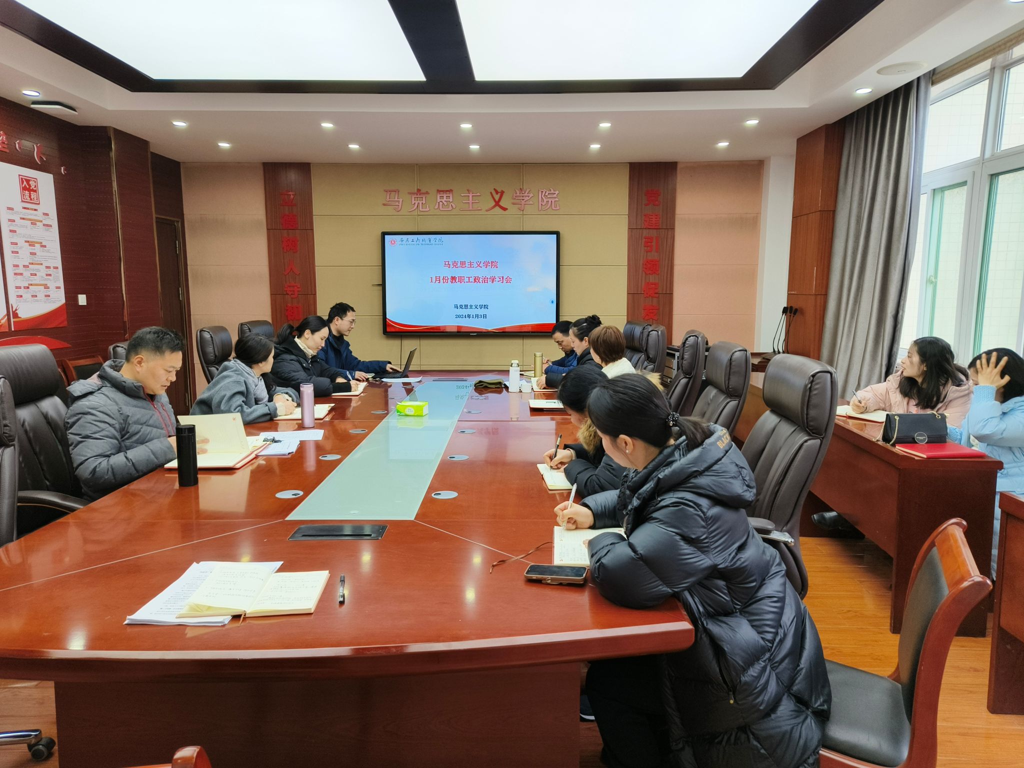 1月4日下午,马克思主义学院在明德楼1号会议室召开本年度第1次教职工政治学习会,学习习近平总书记在广西考察时的重要讲话、在纪念毛泽东同志诞辰130周年座谈会时的重要讲话、在中央经济工作会议中的重要讲话,创新理论武装,指导工作实践。院党总支书记、院长葛成飞,副院长蒋强军出席会议。全体教师参加会议,蒋强军主持会议。