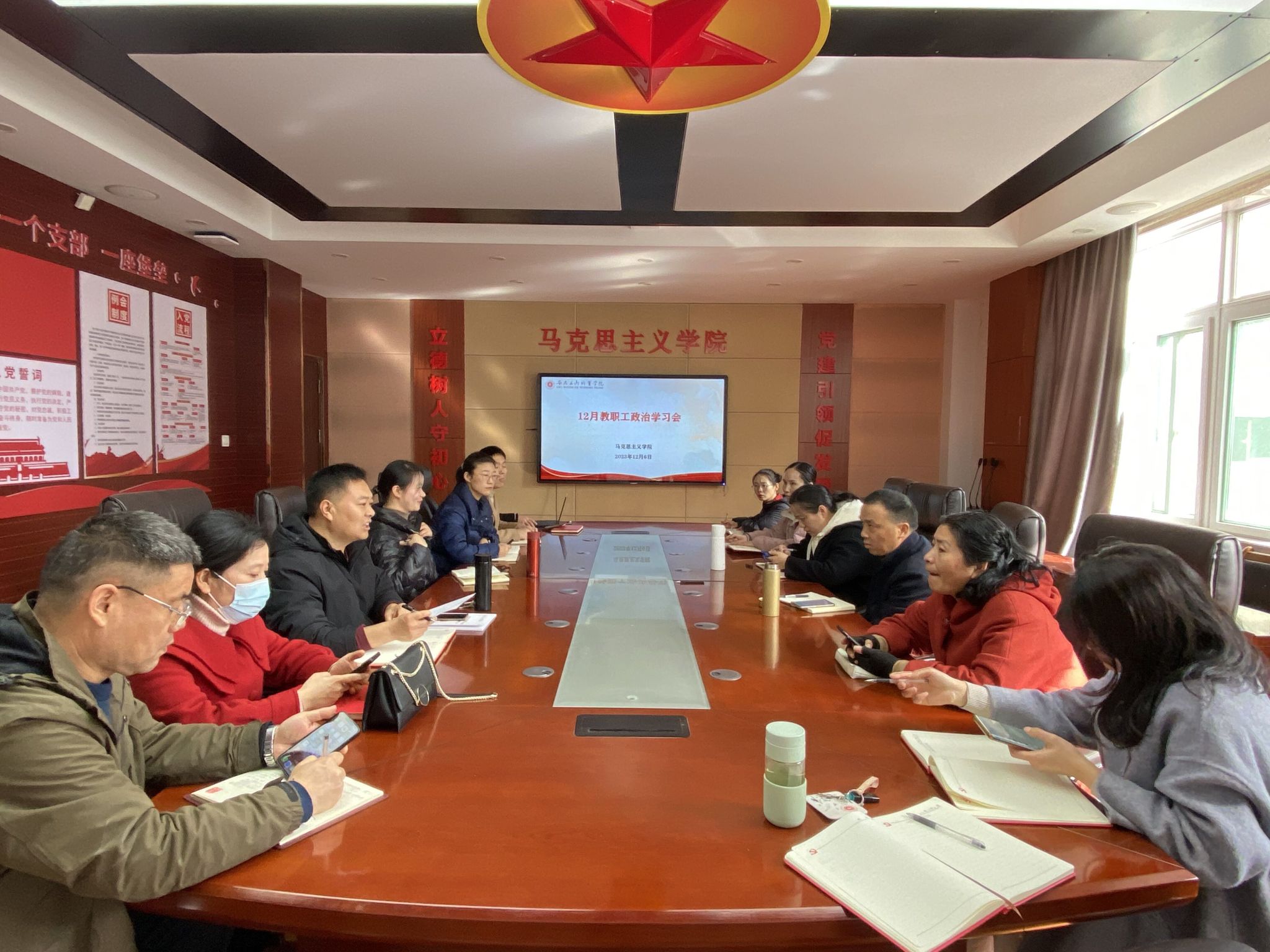 12月6日,马克思主义学院全体教师在明德楼1号会议室开展了本学期第4次教职工政治学习,全体思政课教师参加会议。