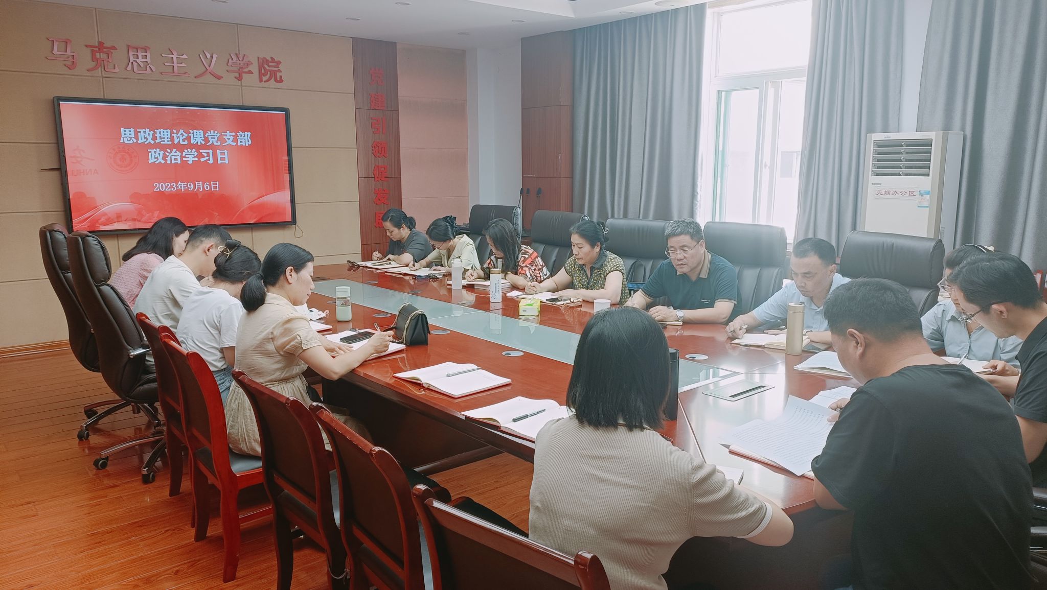 2023年9月6日,马克思主义学院教职工政治学习日活动在明德楼2号会议室举行。全体教师参加会议,马克思主义学院副院长蒋强军主持会议。