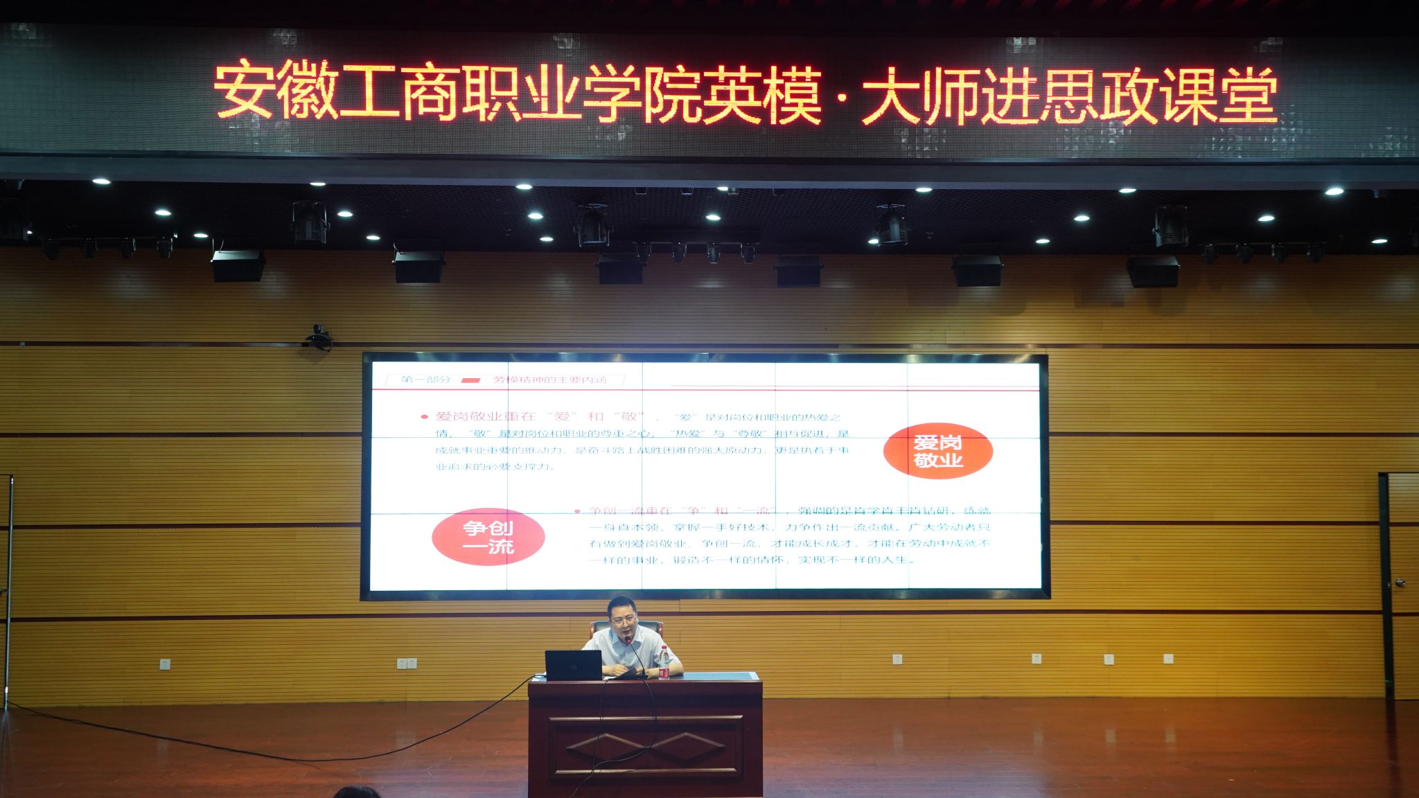 为深入贯彻落实省委教育工委关于在全省高校组织开展新时代先进人物进校园,推进“英模•大师进思政课堂”的通知精神,发挥新时代先进人物的榜样先锋作用。6月20日上午,安徽工商职业学院“英模•大师进思政课堂”主题报告会在双凤校区学术报告厅举行。安徽省劳动模范、全国金融五一劳动奖章获得者高健应邀走上“三尺讲台”, 向学生们分享自己的奋斗经历与感悟,在莘莘学子心中播下奋斗的种子。300余位师生参加讲座,马克思主义学院党总支书记、院长葛成飞主持报告会。
