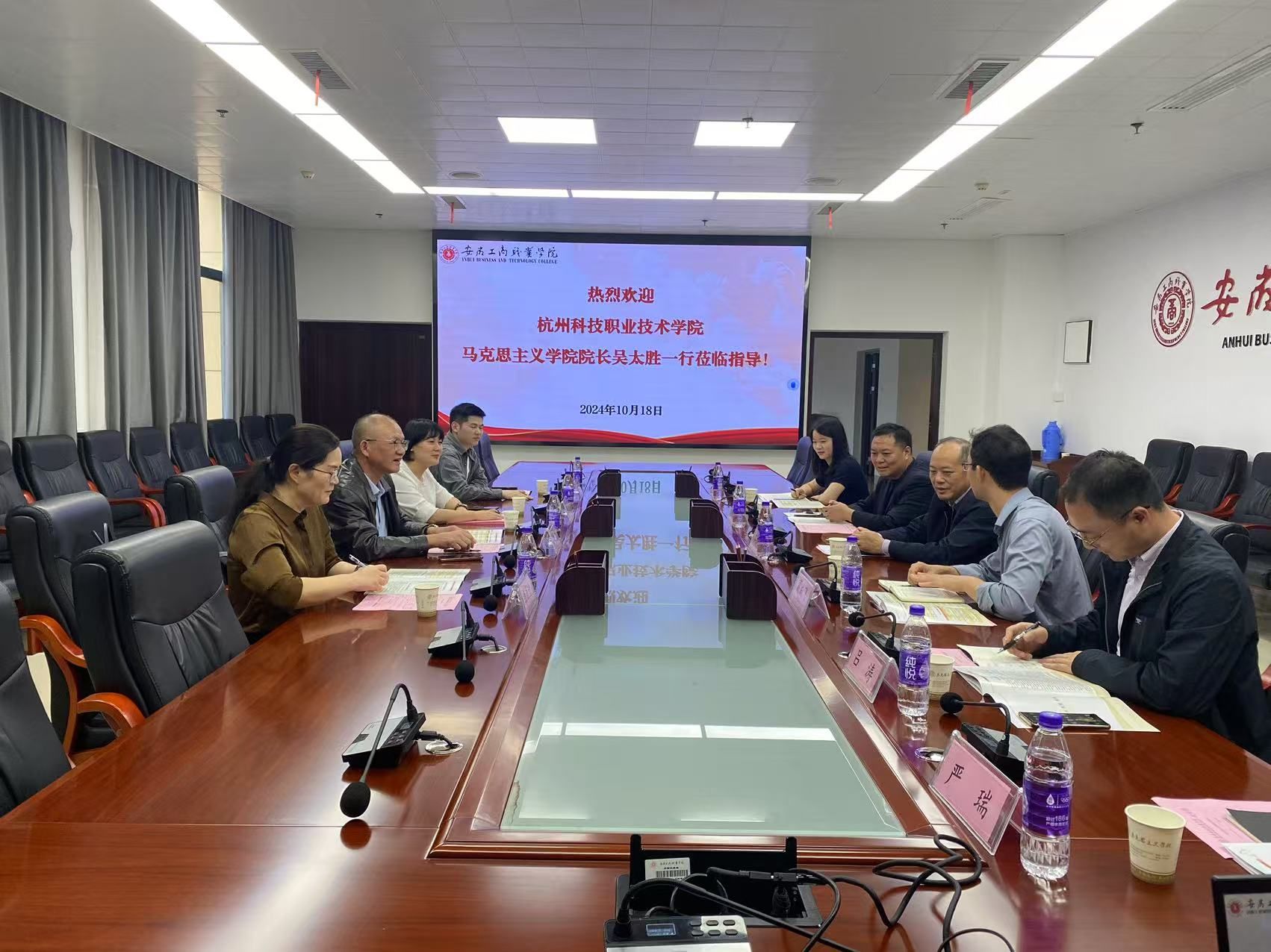 10月18日,杭州科技职业技术学院马院院长吴太胜、习近平新时代中国特色社会主义思想概论教研室主任熊蕾、思想道德与法治教研室主任裘肖平、杭州市大中小学思政课一体化建设项目负责人徐威等一行四人来我校调研交流。校党委书记齐建平热情接待,马院主要负责人及相关教研室主任、办公室人员等陪同接待并交流。
