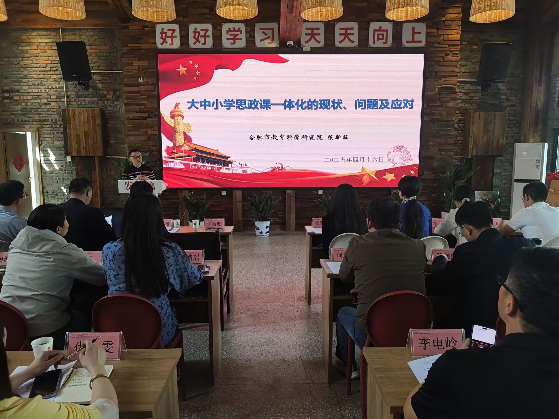 在马郢村小礼堂,来自合肥市教育科学研究院的两位专家进行了专题报告。教研员侯新旺围绕《大中小学思政课一体化的现状、问题及应对》作专题报告。侯新旺详细介绍了安徽省各地大中小学思政课一体化建设共同体的发展现状、瓶颈问题以及破题之策,提出要着力打造纵向贯通、横向联通、协作融通,深耕“四类课堂”,落实“八个目标”的“三四八八”大思政课育人新格局。教研员徐文墙围绕《大中小学思政课一体化建设的小学启蒙》作专题报告。徐文墙从课程建设的启蒙、教师队伍的启蒙、课堂教学的启蒙、教育科研的启蒙、一体化的纵横衔接五个方面详细解读了如何在小学阶段启蒙道德情感,引导学生形成爱党、爱国、爱社会主义、爱人民、爱集体的情感。