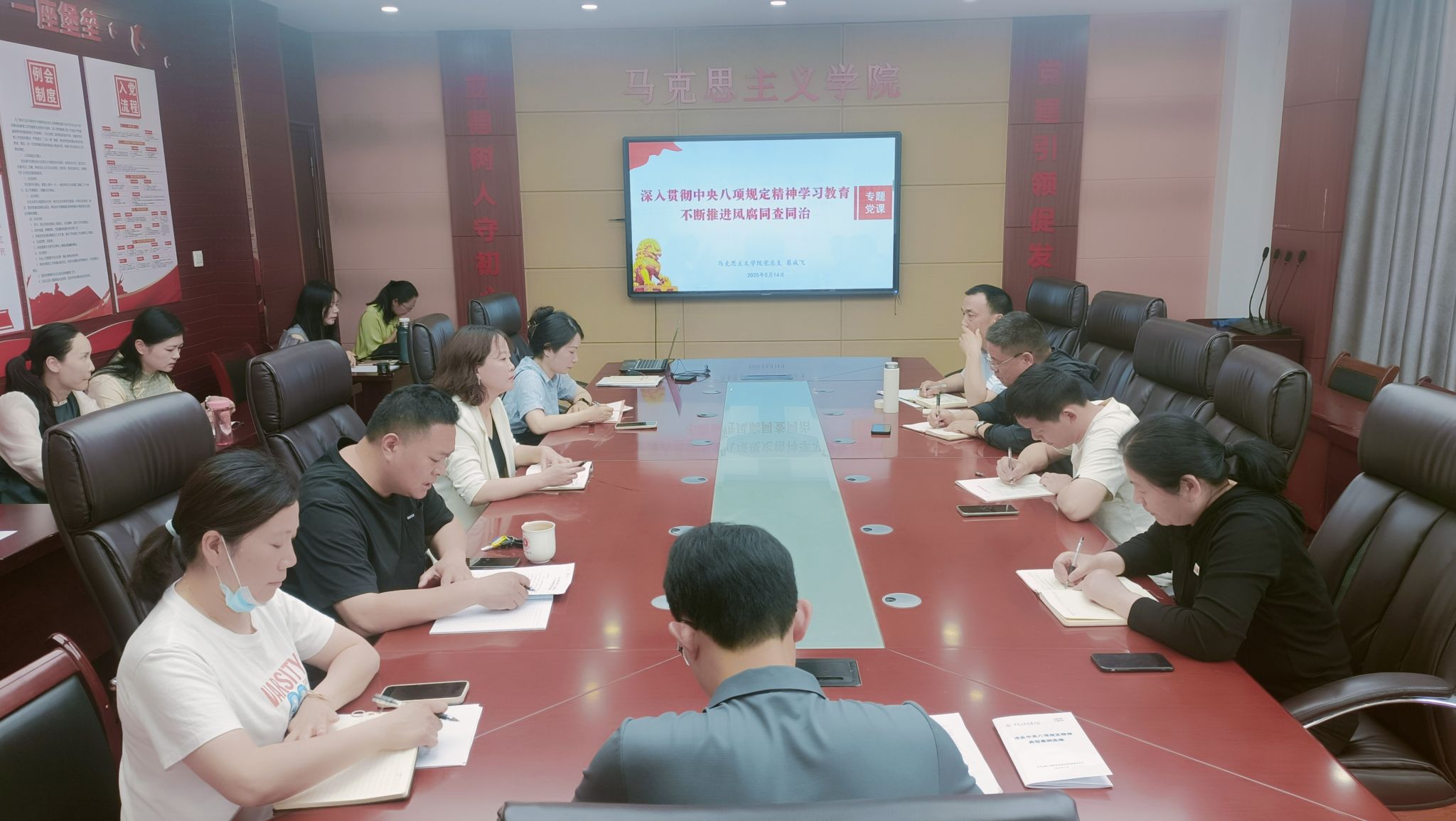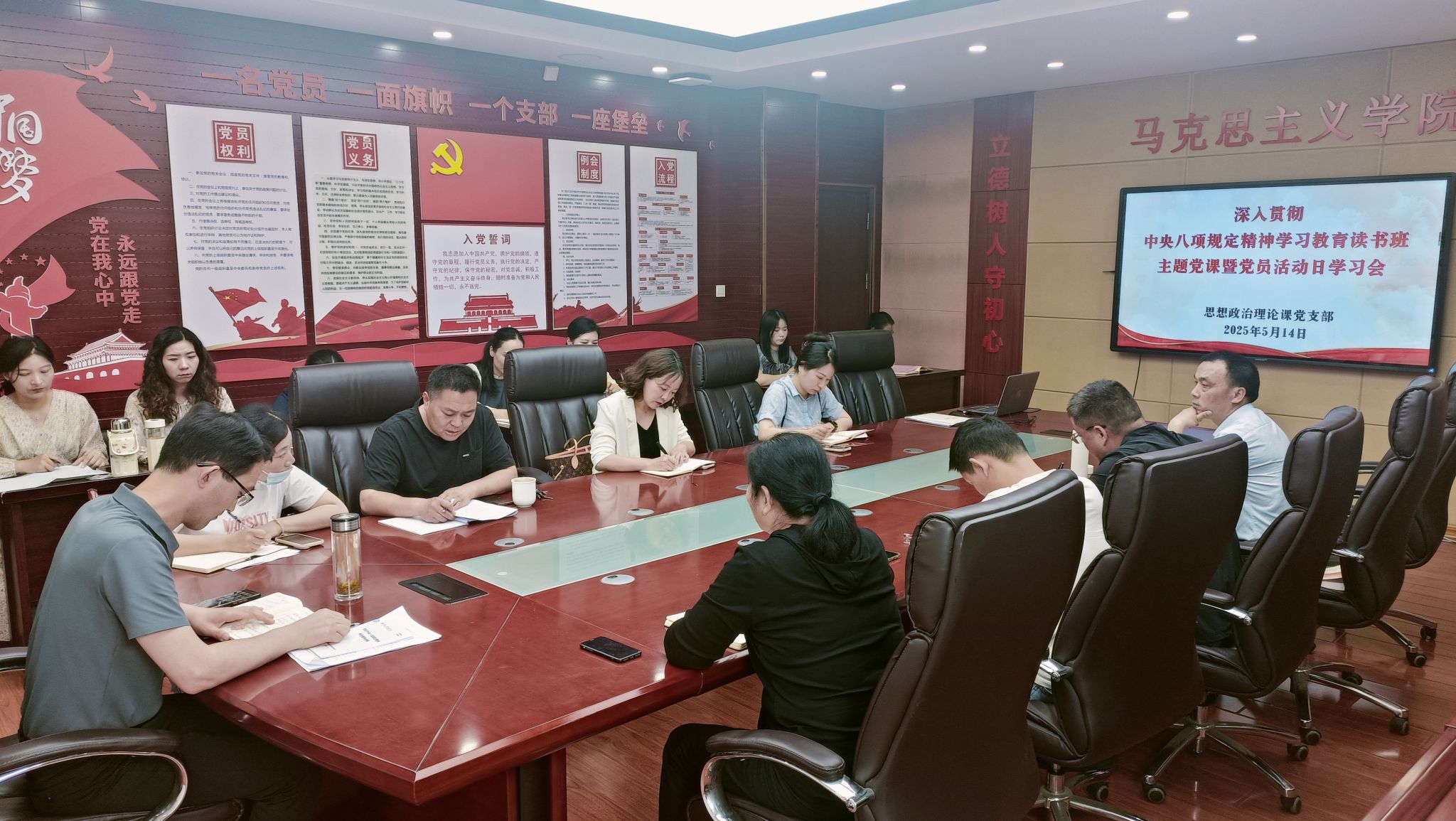 为扎实开展深入贯彻中央八项规定精神学习教育,强化党风廉政建设,5月14日,思政课党支部继续开展深入贯彻中央八项规定精神学习教育读书班暨党员活动日学习活动。马克思主义学院党总支书记、院长葛成飞讲授主题党课,支部书记蒋强军主持会议,全体党员参与学习。