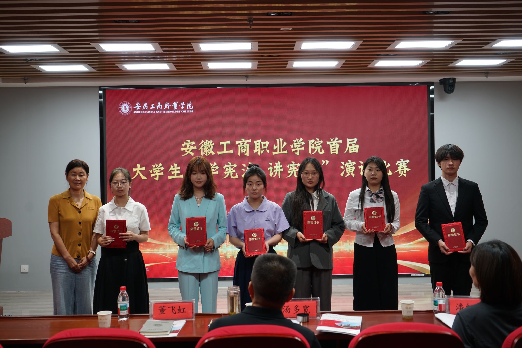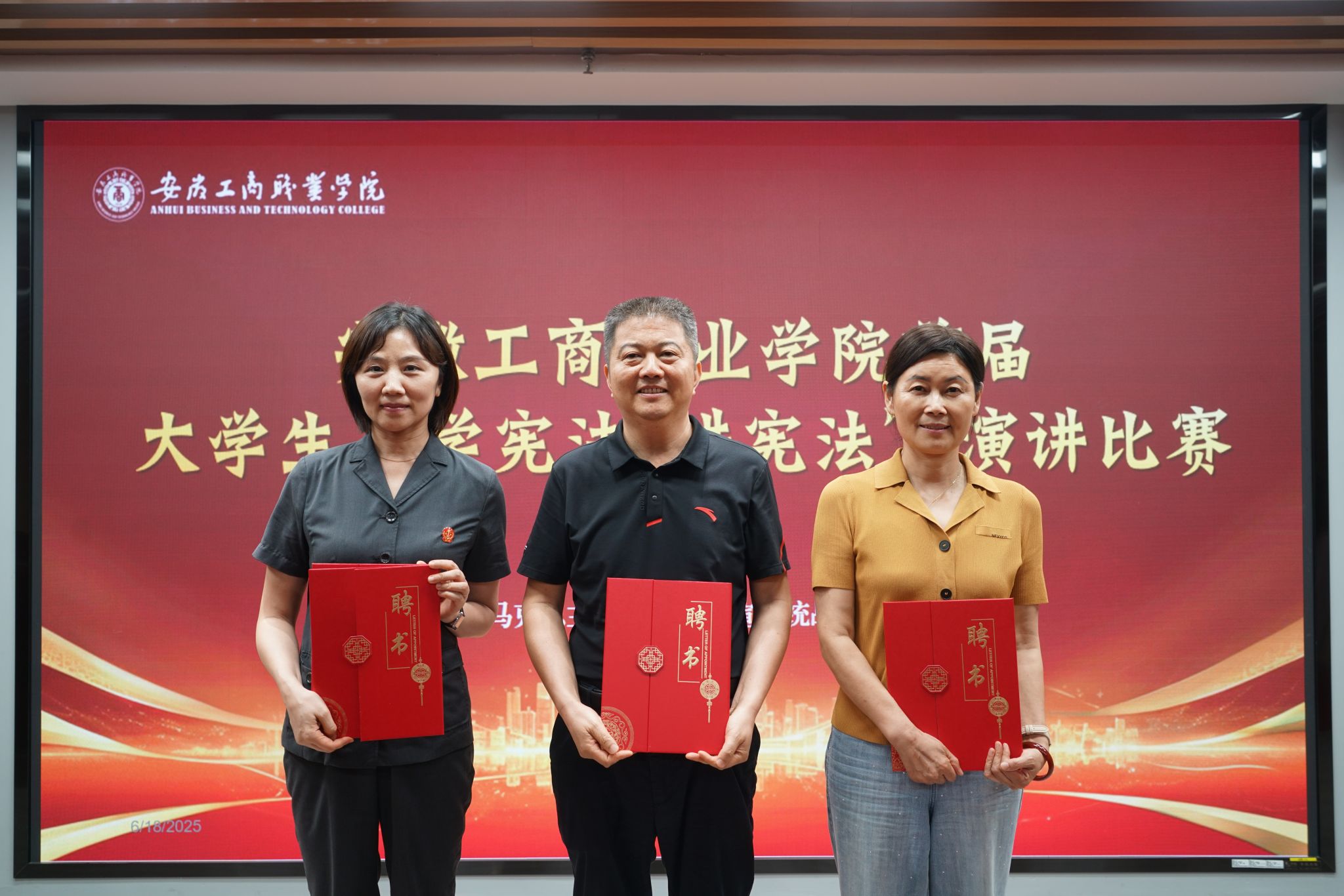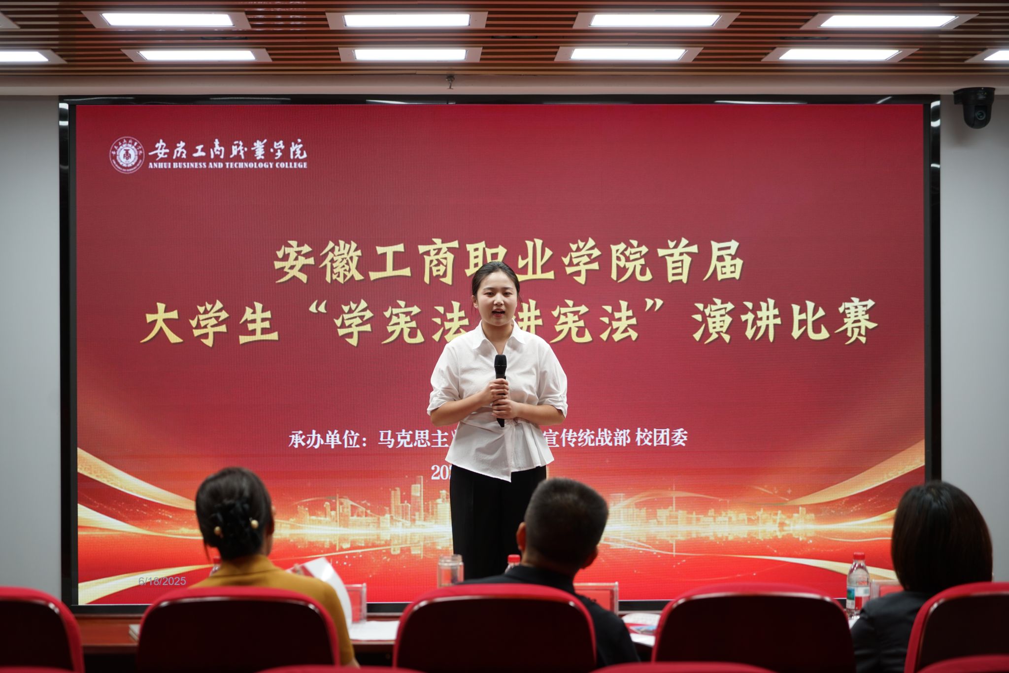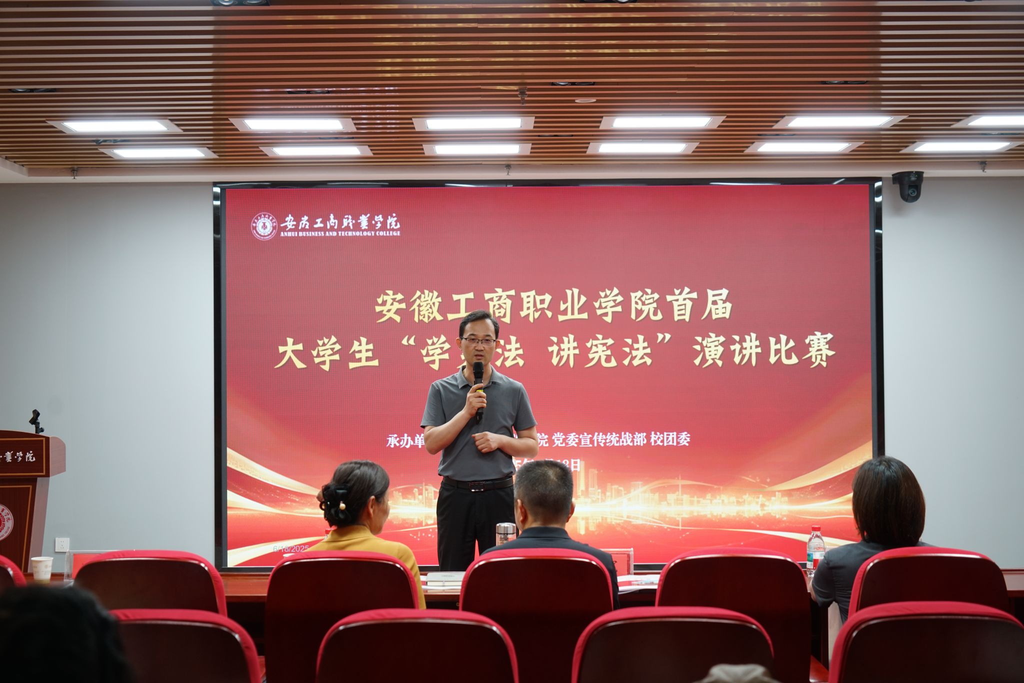 6月18日,安徽工商职业学院首届大学生“学宪法讲宪法”演讲决赛在综合楼智慧思政红色报告厅精彩上演。12名选手以“宪法之光映青春:做新时代法治中国的追光者”为主题,用青年视角诠释宪法精神,以时代语言传递法治温度,展现出青春与法治同频共振的担当。马院主要负责人、比赛指导老师、全体思政课教师及部分学生代表现场观赛。