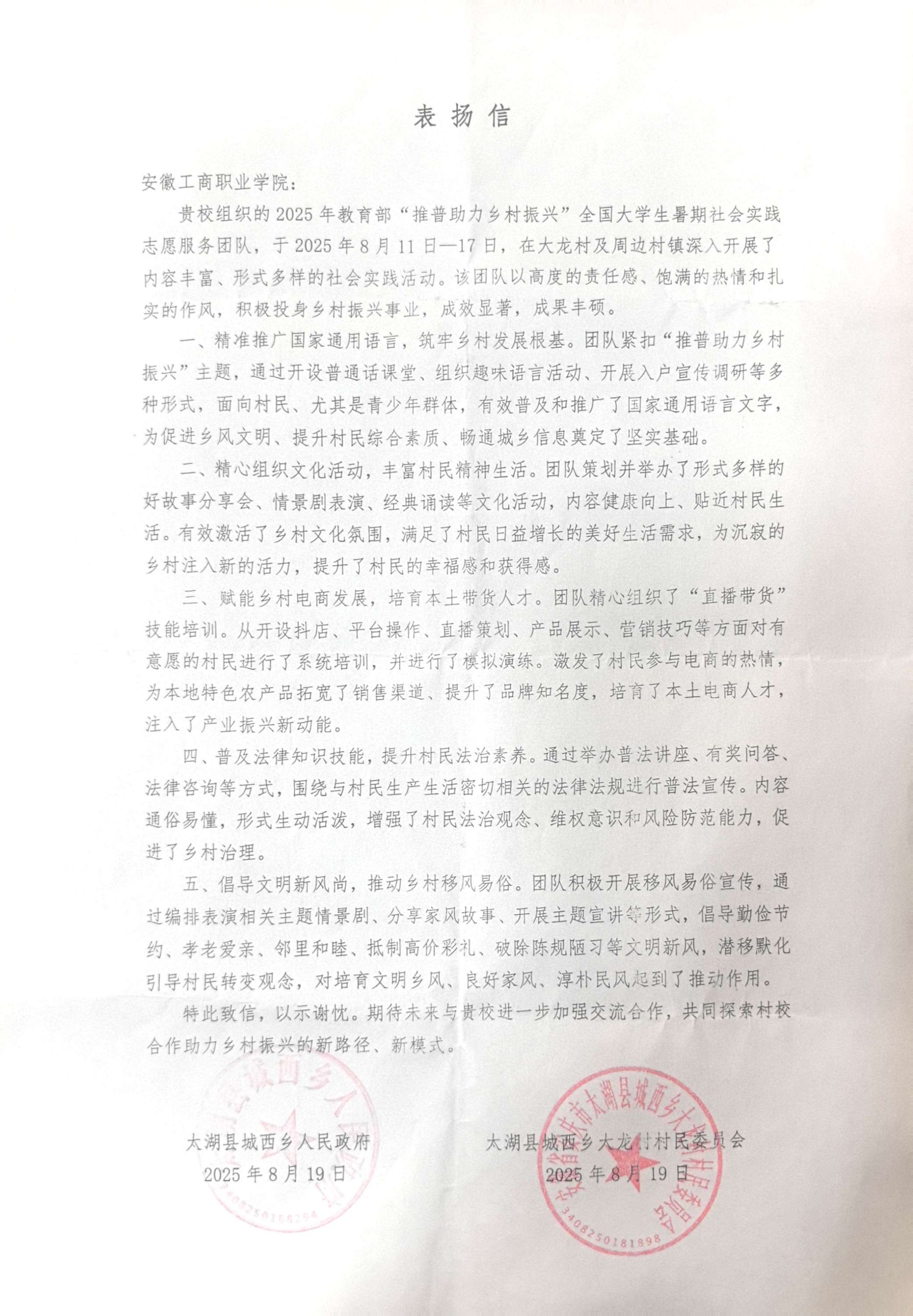 2025年8月11日-17日,2025年教育部“推普助力乡村振兴”全国大学生暑期社会实践志愿服务活动重点团队——安徽工商职业学院“普育乡风”志愿服务队赴太湖县大龙村开展为期一周的社会实践志愿服务活动。志愿服务活动开展前夕,团队在马克思主义学院会议室举行了出征仪式。