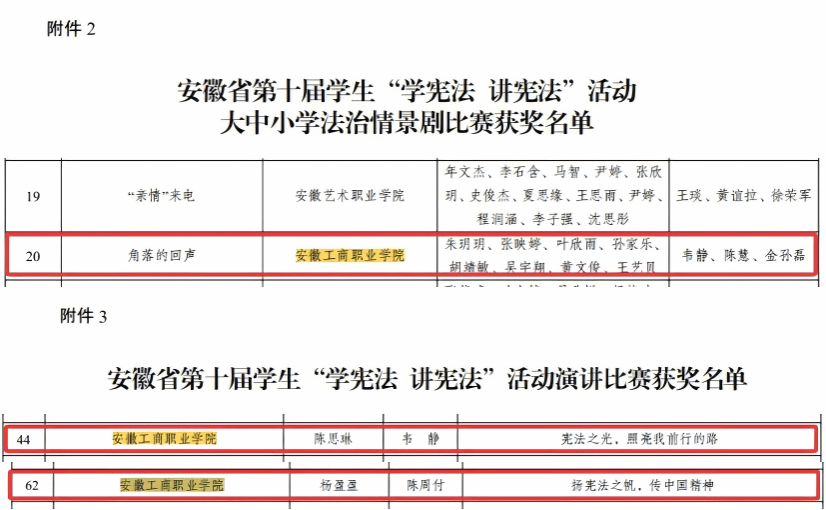 日前,安徽省第十届全省学生“学宪法 讲宪法”系列活动落下帷幕,我校艺术学院2024级幼儿管理3班的陈思琳、24级工程造价2班杨盈盈两名选手参加了省高校组演讲比赛,喜获优秀奖(指导老师:韦静、陈周付)。24级电子商务8班的朱玥玥、张昳婷、叶欣雨等八位同学参加全省第十届学生“学宪法 讲宪法”大中小学法治情景剧比赛,获得优秀奖(指导老师:韦静)。