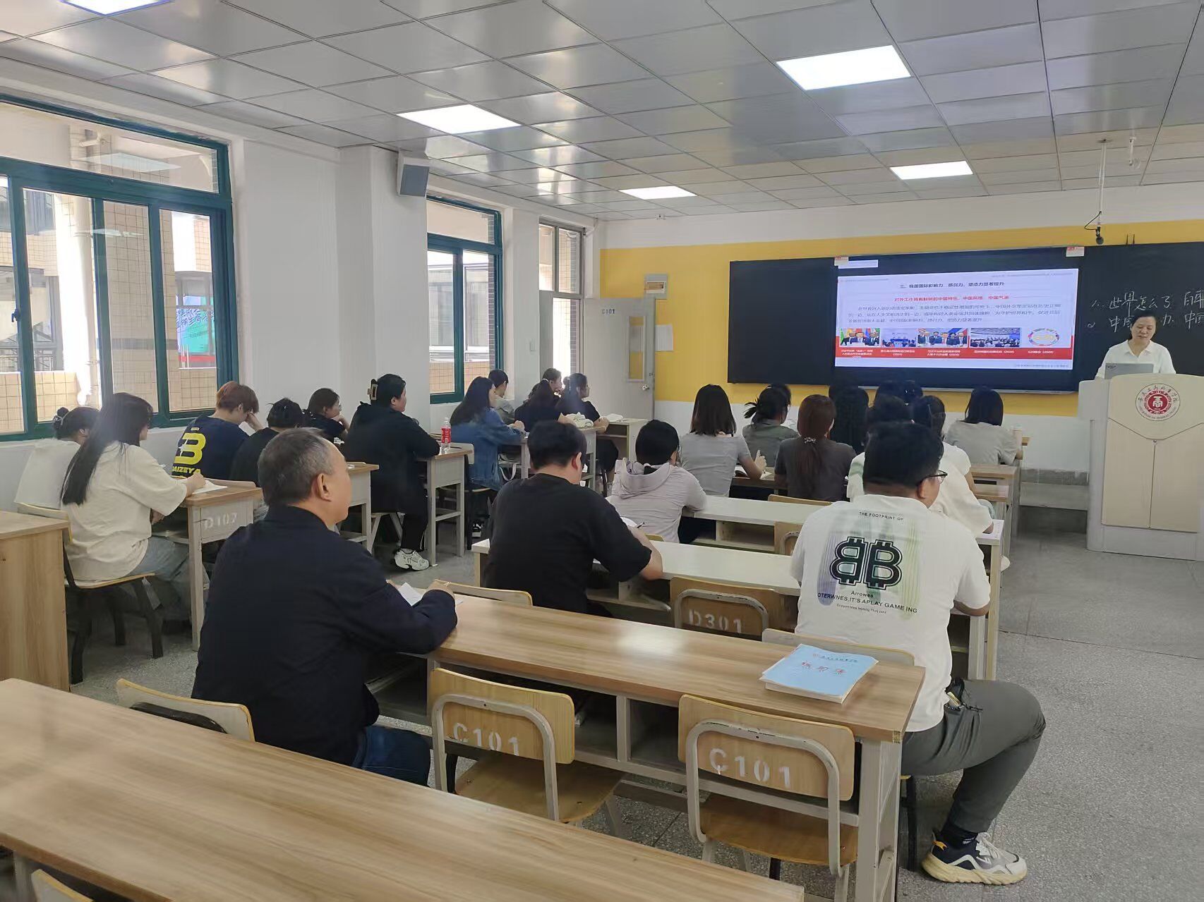 专家采取随机抽取、推门听课的方式,听取了文珂老师讲授的《习近平新时代中国特色社会主义思想概论》课“第十六章第一节新时代中国外交在大变局中开创新局”教学内容。教学中,授课教师坚持以学生为中心,紧密结合学生思想学习实际,整合教学资源、充分运用案例、积极开展课堂互动,教学组织有力有效。