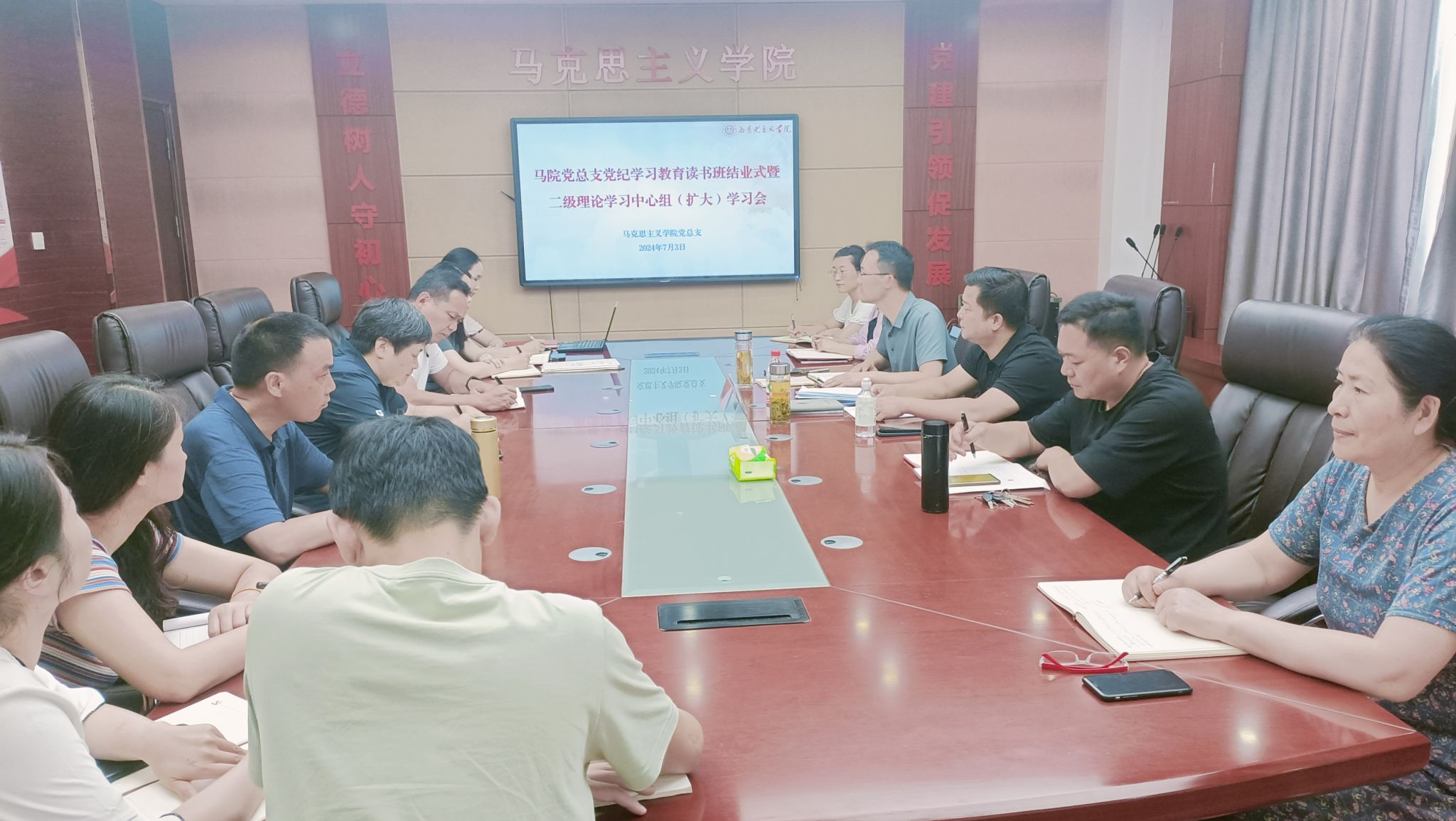 7月3日,马克思主义学院党总支举行党纪学习教育读书班结业式暨二级理论学习中心组第十次学习会。学习《习近平关于全面加强党的纪律建设论述摘编》《中国共产党纪律处分条例》(下称《条例》),传达《安徽省教育厅关于弘扬教育家精神进一步加强师德师风建设和法治教育工作的通知》,邀请相关专家进行专题辅导报告,总支全体委员及部分思政课教师参加学习,马院党总支主要负责人主持结业式。