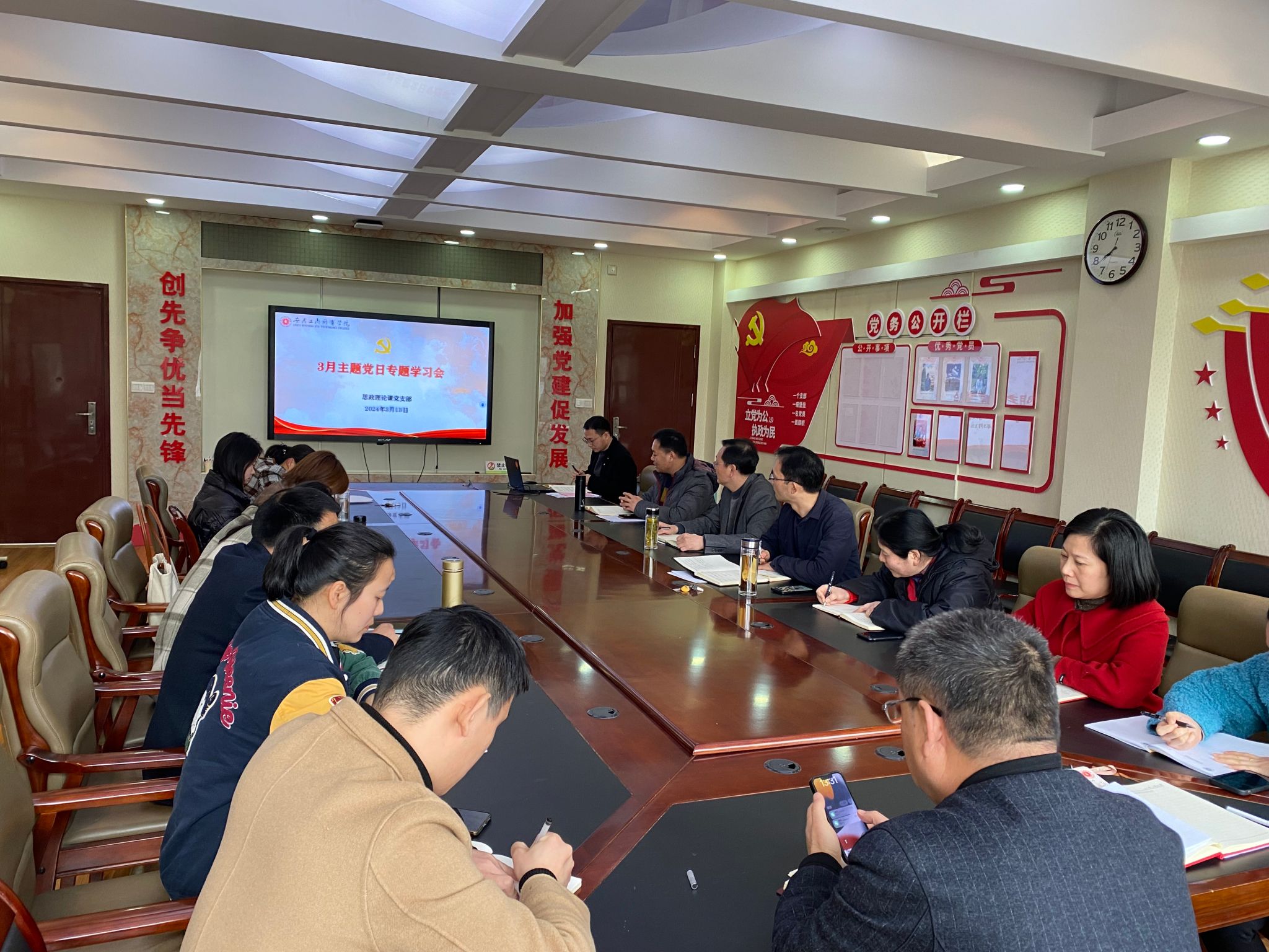3月13日,思政理论课党支部在明德楼1号会议室开展新学期第1次主题党日学习,专题学习了全国两会、全省教育工作会议精神等内容,与会人员结合工作实际进行了深入交流和研讨。校党委委员、副校长陈章奇以普通党员身份参加学习会,支部全体党员参会,支部书记蒋强军主持会议。