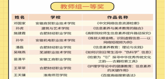 在此次大赛中,我校师学生凭借扎实的知识储备和良好的信息素养,在众多参赛者中脱颖而出。我校图书馆苗清平老师在教师组微课赛中荣获一等奖;信息工程学院的朱文键同学荣获学生组三等奖;同时图书馆胡凡、苗清平两位老师在赛前为学生提供了专业的辅导和支持,帮助学生提升了信息检索、分析和应用的能力,最终荣获“优秀指导教师奖”。