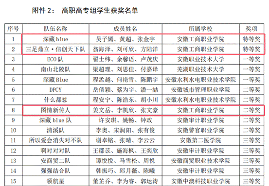 本次赛事共吸引省内77所高校的539支队伍同台竞技,包含 11131 名本科生、10975 名高职高专生、1242 名研究生(含博士生)参赛规模创历史新高。经过激烈角逐,我校选派的三支参赛队伍,在图书馆苗清平老师、管理学院申畅老师以及信息工程学院黄梅娟、徐祥辉老师的悉心指导下,表现优异,斩获多项大奖。其中,“深藏blue队”(成员:吴子嫣、黄超、张金宇)与“三足鼎立·信创天下队”(成员:刘可欣、方陆洋、翁海泽)两支队伍荣获学生组特等奖;“图情新传人队”(成员:姜文岳、李凯欣、张文豪)获得二等奖。同时,我校荣获“优秀组织奖”,四位老师获评“优秀指导教师”。