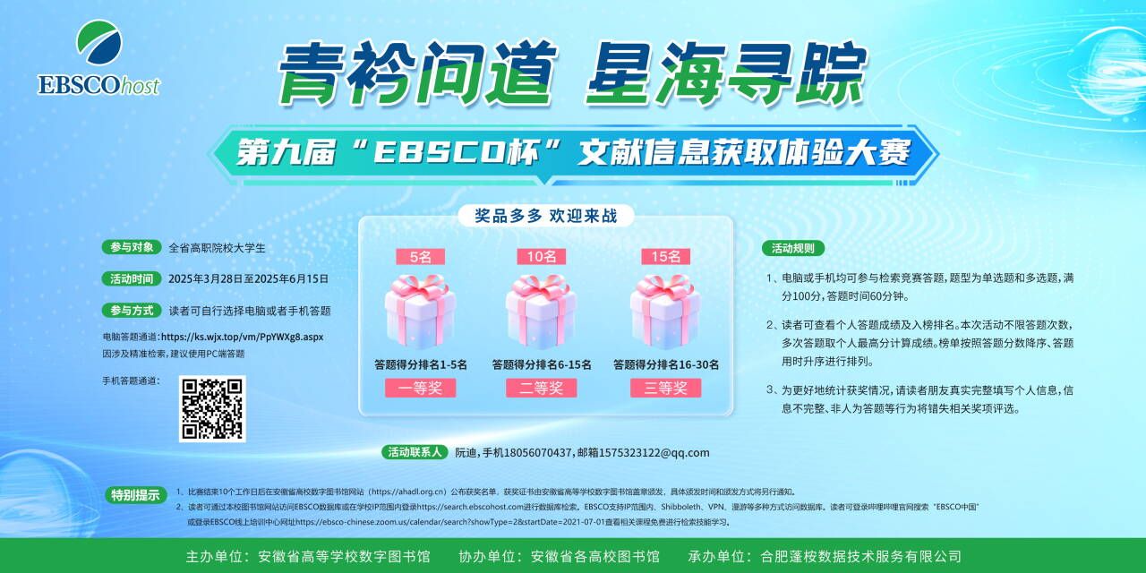 AI浪潮奔涌,数据星河浩瀚。面对信息沧海,如何精准撷取知识文献是图书馆和读者思考和探索的问题。为更好地帮助读者朋友利用图书馆文献资源,提升信息素养水平,助力学习与科研,安徽省高等学校数字图书馆与EBSCO数据库诚邀全省读者共同参与第九届“EBSCO杯”文献信息获取体验大赛,相关活动细则如下: