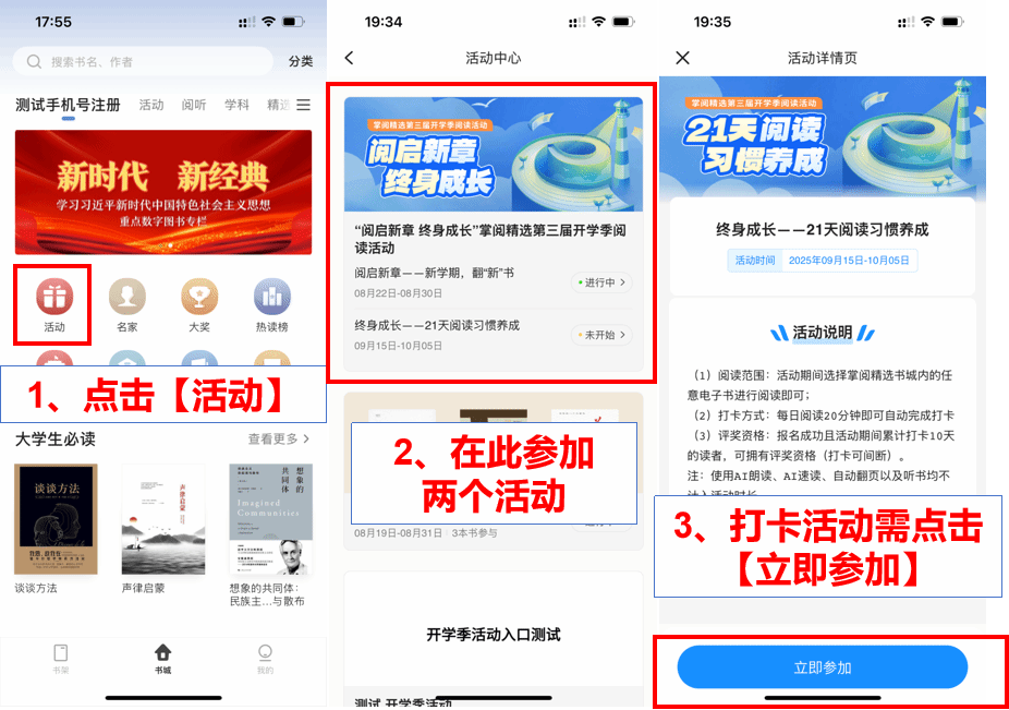 点击顶部【活动】进入后即可参与新学期,翻“新”书及阅读打卡活动。