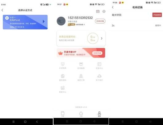 4)认证一:机构IP认证----机构切换----本校名称----开始使用