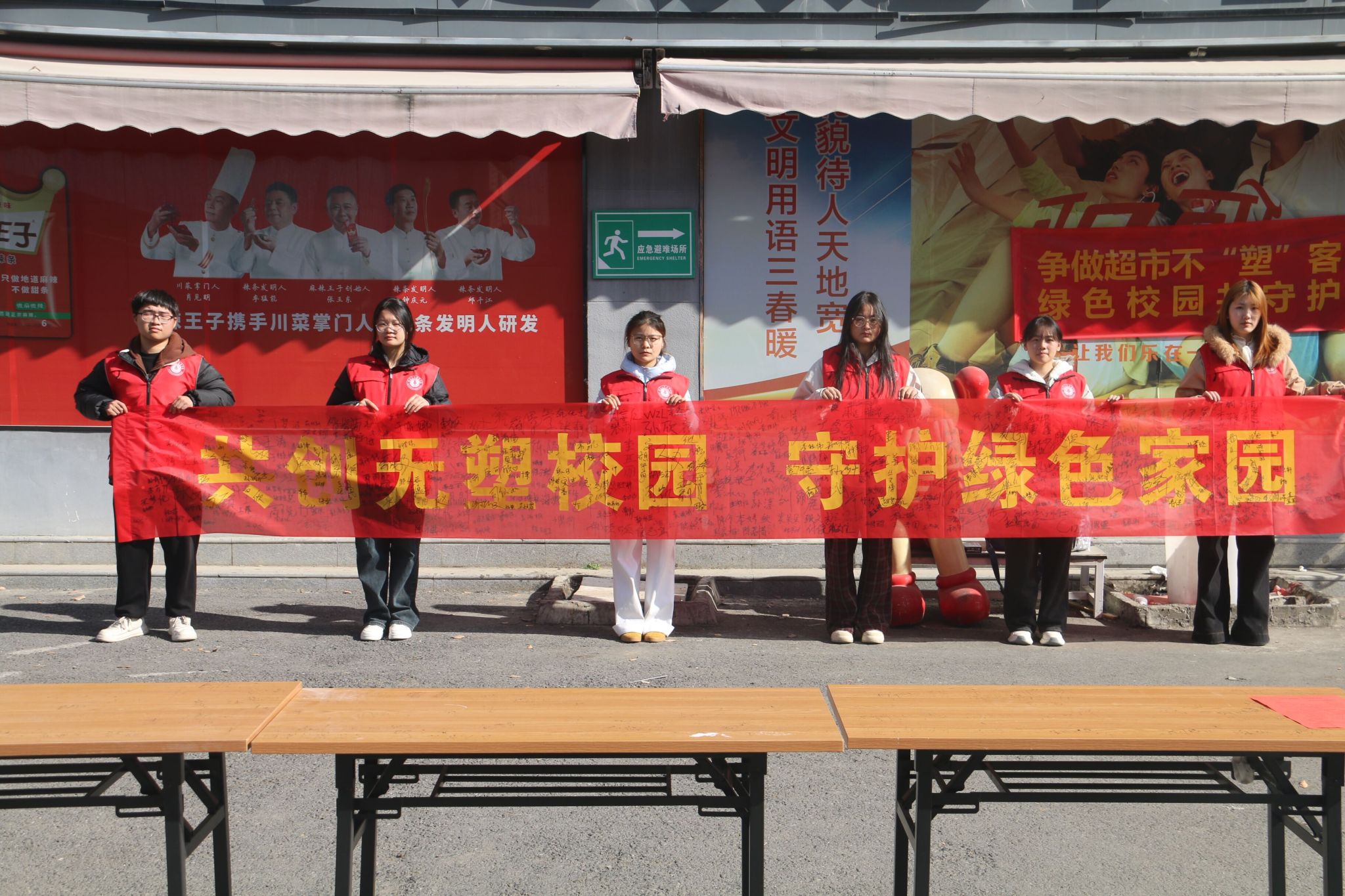 活动现场最为引人注目的环节是横幅签名承诺。印有“共创无塑校园,守护绿色家园”醒目字样的横幅徐徐展开,师生们积极响应,郑重地在横幅上签下自己的名字。一个个签名,不仅代表了对禁塑倡议的个人承诺,更象征着投身环保实践、守护绿色家园的集体决心。横幅逐渐被充满责任感的签名填满,成为校园里一道亮丽的风景线。与此同时,校广播站同步发力,面向全体师生播报《“无塑校园”行动倡议书》全文。清晰而富有感染力的声音回荡在校园各个角落,将“减少塑料污染,共建绿色校园”的理念持续传递,与线下活动形成有力呼应,实现了宣传效果的全覆盖。
