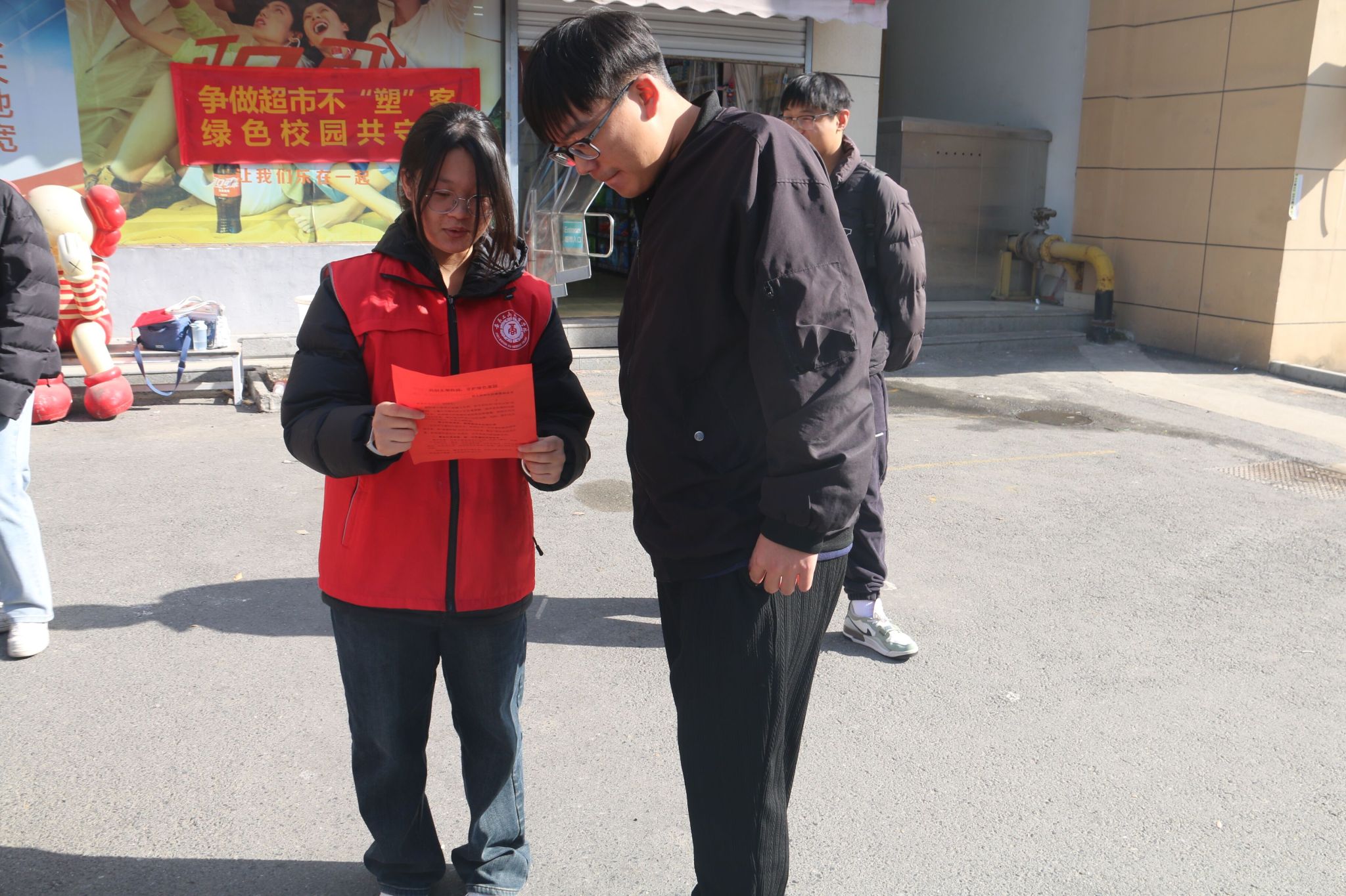 活动当日,校园内气氛热烈。学生志愿者们在人流集中区域设立了宣传倡议点。他们热情地向过往师生分发《共创无塑校园 守护绿色家园——致全校师生的禁塑倡议书》,总计发放约200份。倡议书阐述了塑料制品对生态环境和人体健康的潜在危害,并提出了在日常学习、生活中减少使用一次性塑料制品的具体建议,如自带水杯、使用环保袋、减少外卖包装依赖等。志愿者们不仅进行资料发放,更主动走向前去,结合倡议书内容,向师生们耐心讲解“限塑”“禁塑”的重要性以及垃圾分类、塑料循环利用等相关环保知识。