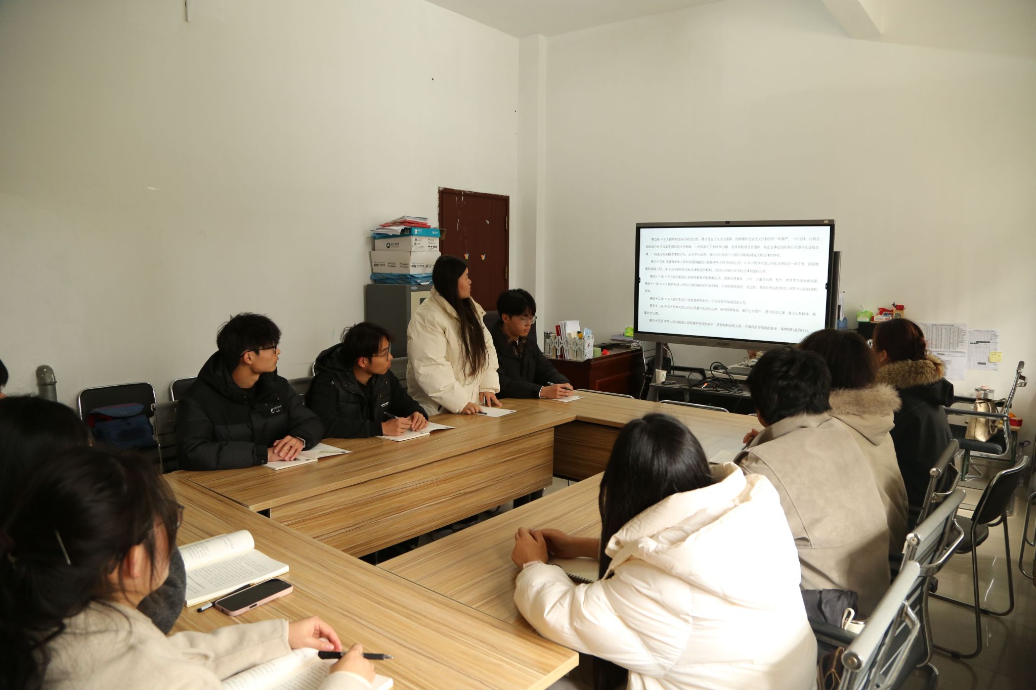活动伊始,团委老师易佳佳带领与会同学共同学习了《习近平法治思想学习纲要(2025年版)》部分重要内容。她强调,习近平法治思想是新时代全面依法治国的根本遵循和行动指南,鼓励同学们要坚持读原著、学原文、悟原理,坚持不懈地学深悟透做实习近平法治思想。她指出,要全面系统学、及时跟进学、深入思考学、联系实际学,自觉用习近平新时代中国特色社会主义思想武装头脑、指导实践,努力将习近平法治思想内化于心、外化于行,切实把学习成效转化为助力推进全面依法治国、建设法治中国的青春动能与生动实践。