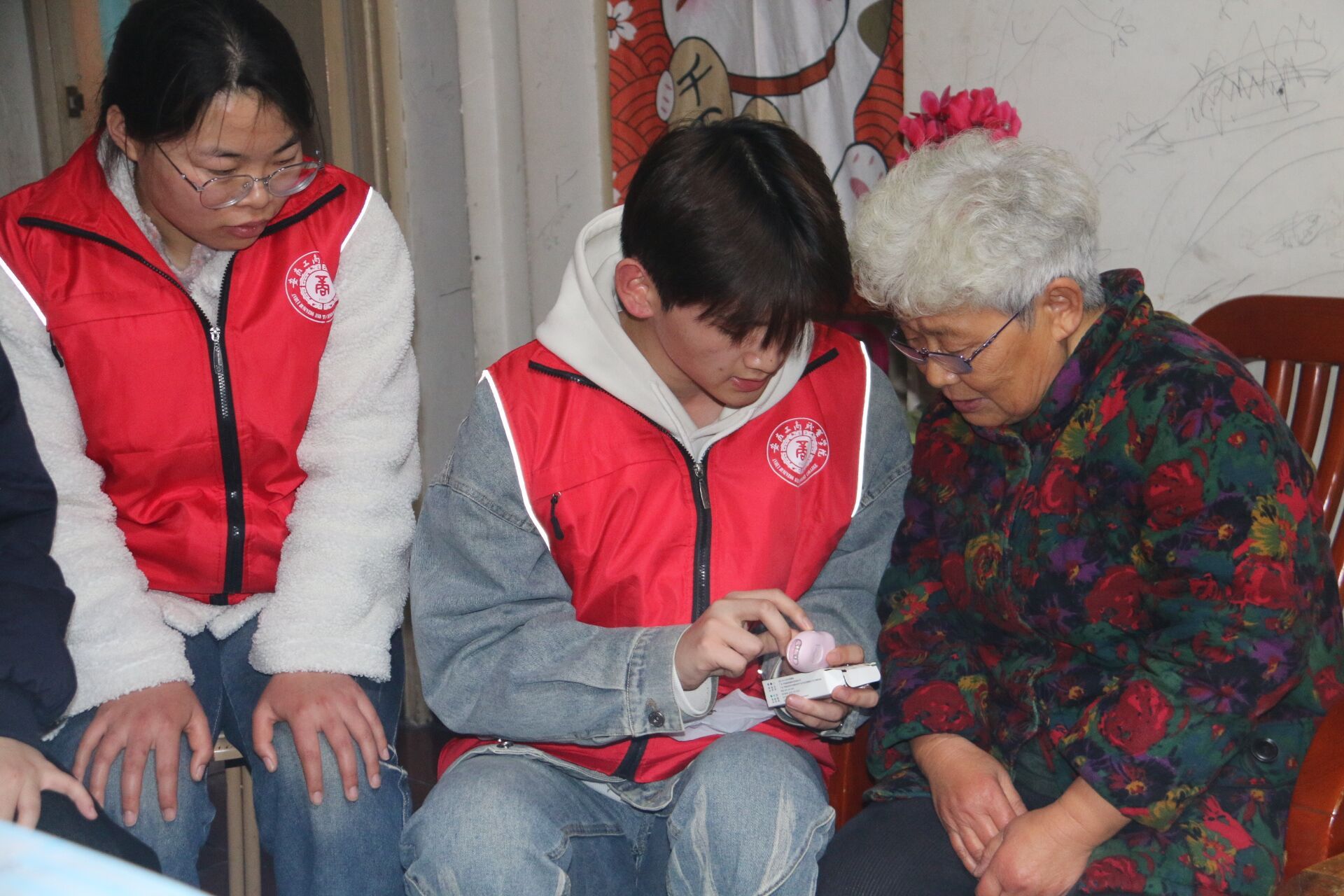 启动仪式结束后,志愿者们在社区工作人员的带领下,深入双桥社区自管小区绿都新村三户纳入“窗帘之约”服务体系的独居老人家中进行走访。每到一户,都是一次心与心的交流。志愿者们首先代表学校向老人们送上了精心准备的生活小礼品。随后,大家立刻忙碌起来:有的拿起抹布、扫帚,帮老人擦拭门窗、打扫室内卫生,让老人的居住环境焕然一新;有的围坐在老人身边,像孙辈一样陪着老人唠家常,详细询问他们的身体状况和饮食起居,耐心倾听他们的心声,用实际行动缓解老人因独居带来的孤寂感;有的将带有“窗帘之约”标识的窗花,小心翼翼地贴在老人家中的窗户上。这扇窗,不仅是房屋的通风口,更是连接社区与老人的“安全信号灯”;有的给老人分发社区专门定制的印有网格员和业委会成员联系电话的硬质钥匙扣;有的向老人介绍社区准备的居家安全报警器,并手把手地教老人如何正确使用。“奶奶,按一下可以作为夜间手提小夜灯使用,如果您遇到突发情况就按两下,它会发出报警声,社区第一时间就能收到信息赶来。”志愿者们耐心细致地讲解,为老人的居家安全加上了一道“技防”保险,让关爱更智能、更精准。