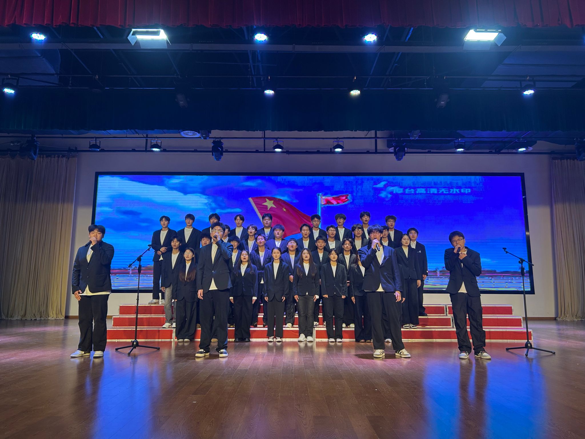 展演在经典旋律《我爱你中国》中拉开帷幕,同学们用深情而饱满的歌声,唱出了对祖国山河的无限热爱与眷恋,瞬间点燃了全场观众的爱国热情。随后,各参演队伍依次登台,倾情演绎了一首首脍炙人口的红色经典。《紫荆花盛开》以温婉动人的曲调,抒发了对香港繁荣稳定的美好祝愿,体现了血浓于水的家国情感;《我和我的祖国》以熟悉的旋律,表达了青年学子与祖国母亲一刻也不能分割的深厚情感;《我们走在大路上》节奏铿锵、意气风发,唱出了新时代青年紧跟党走、奋勇前进的坚定信念;深情款款的《怀念战友》,将观众带入那段峥嵘岁月,感怀革命先辈的牺牲与奉献;而温暖大气的《灯火里的中国》则从百姓视角眺望万家灯火,展现了国泰民安、繁荣发展的盛世图景。最后,气势磅礴的《强军战歌》压轴登场,激昂的旋律与豪迈的歌词,展现了学子们心系国防、支持军队建设的赤子之心。