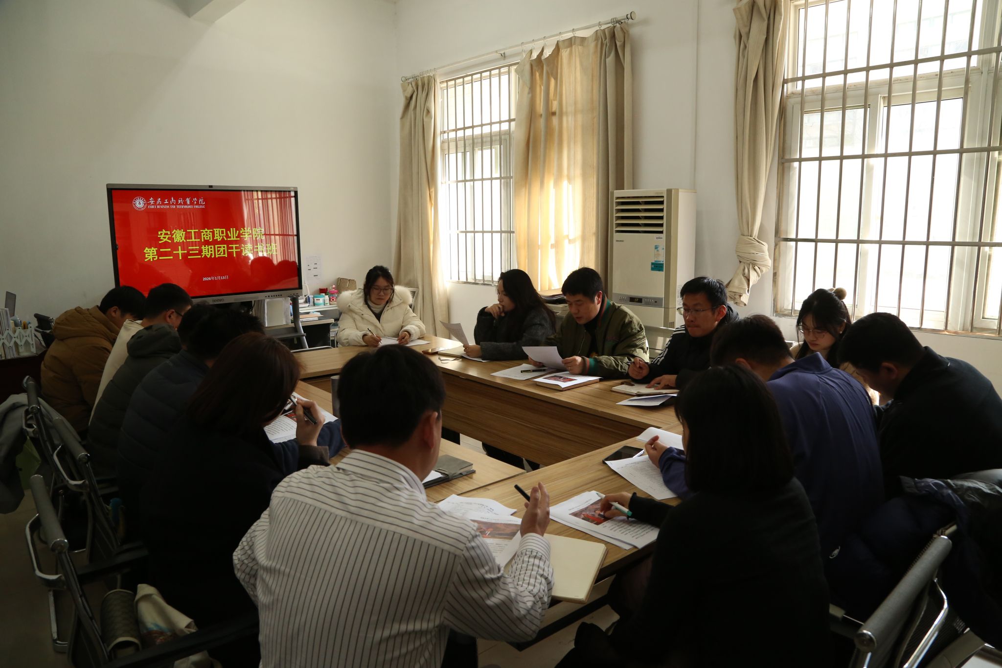 1月13日,安徽工商职业学院第二十三期团干读书班于团委会议室举办。校团委委员及各二级学院团总支书记参会,本次读书班由校团委副书记童乐主持,全体成员围绕“深入学习习近平主席2026年新年贺词”与团学工作实践展开深入交流。