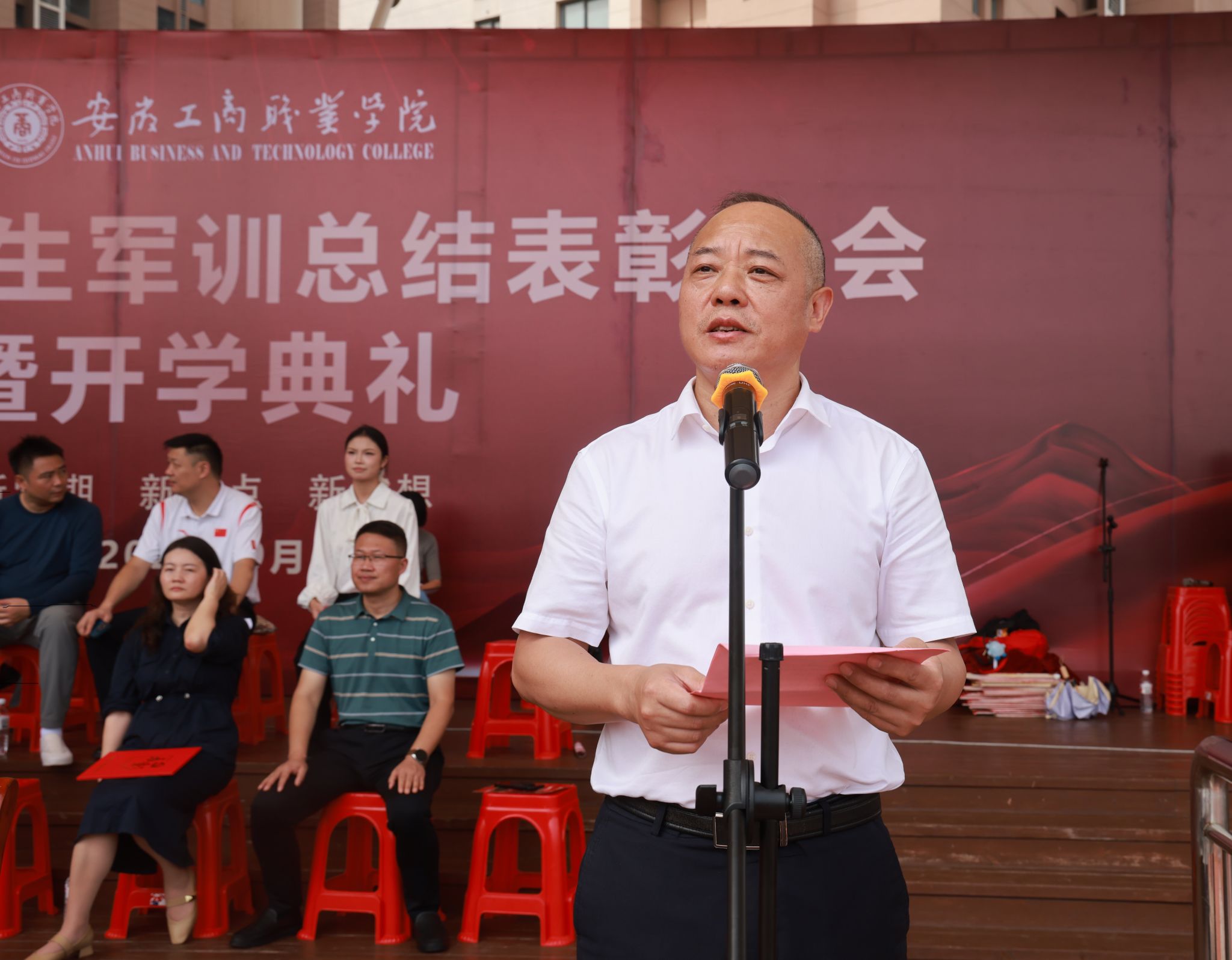 金风送爽,硕果盈枝。9月27日上午,2025级新生军训总结表彰大会暨开学典礼在双凤校区举行。院领导齐建平、陈行、胡捍东、陈章奇、吴松飞,庐阳区武装部部长韩方景,庐阳区杏林街道党工委书记石际等出席典礼。各二级学院和部分职能处室负责人、全体军训教官、新生班级辅导员及2025级全体新生参加典礼。典礼由院党委委员、副院长胡捍东主持。