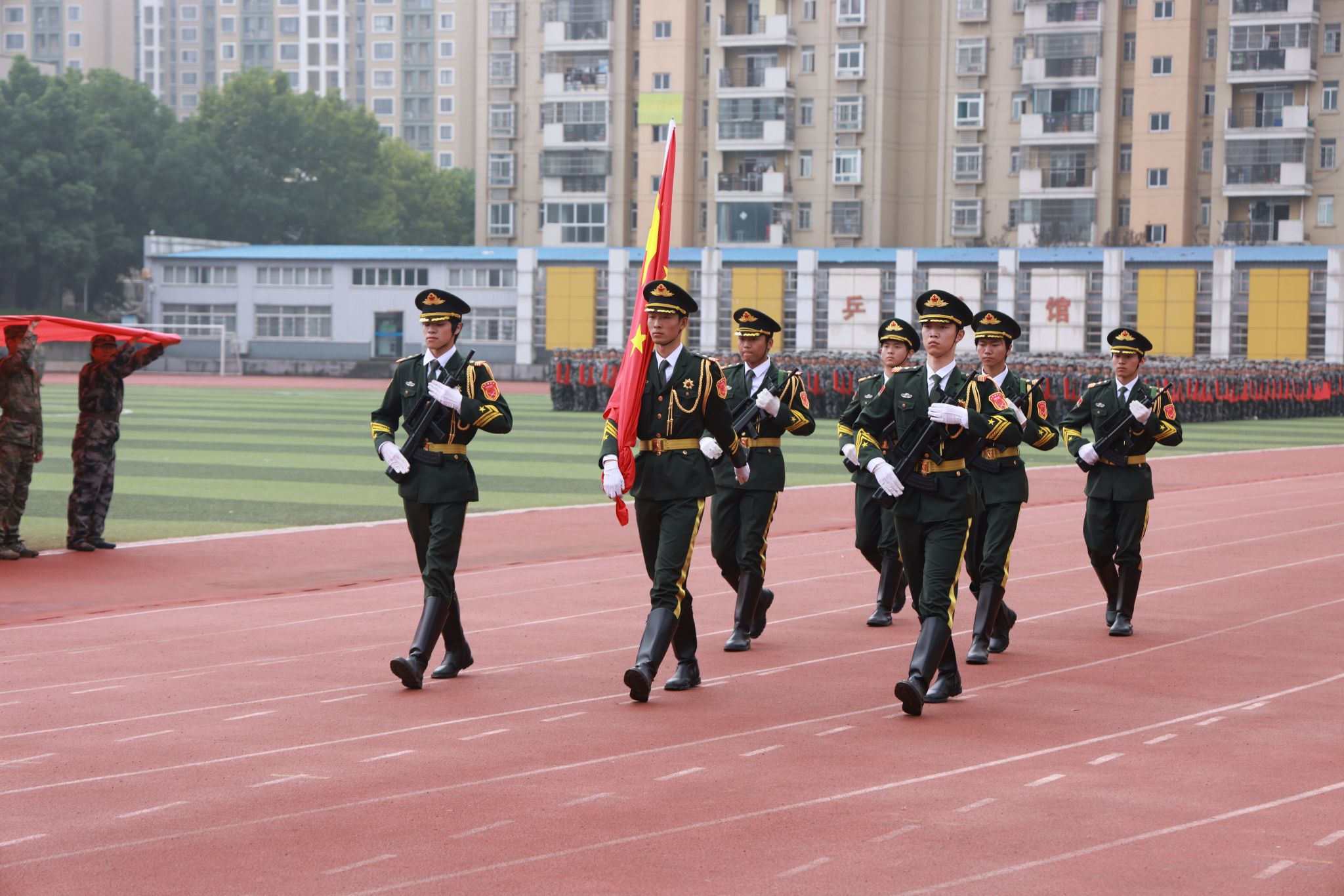 军训汇报表演在庄严的国歌声中伴随冉冉升起的国旗拉开序幕。五千多名参训新生步伐铿锵、口号嘹亮,紧随宏大的国旗方阵,依次走过主席台,将军训锤炼出的钢铁意志与团队精神完美呈现。方队队形展示、战地救护科目展示、军体拳、军歌大合唱等精彩表演,为我们带来了一场震撼的视觉盛宴。