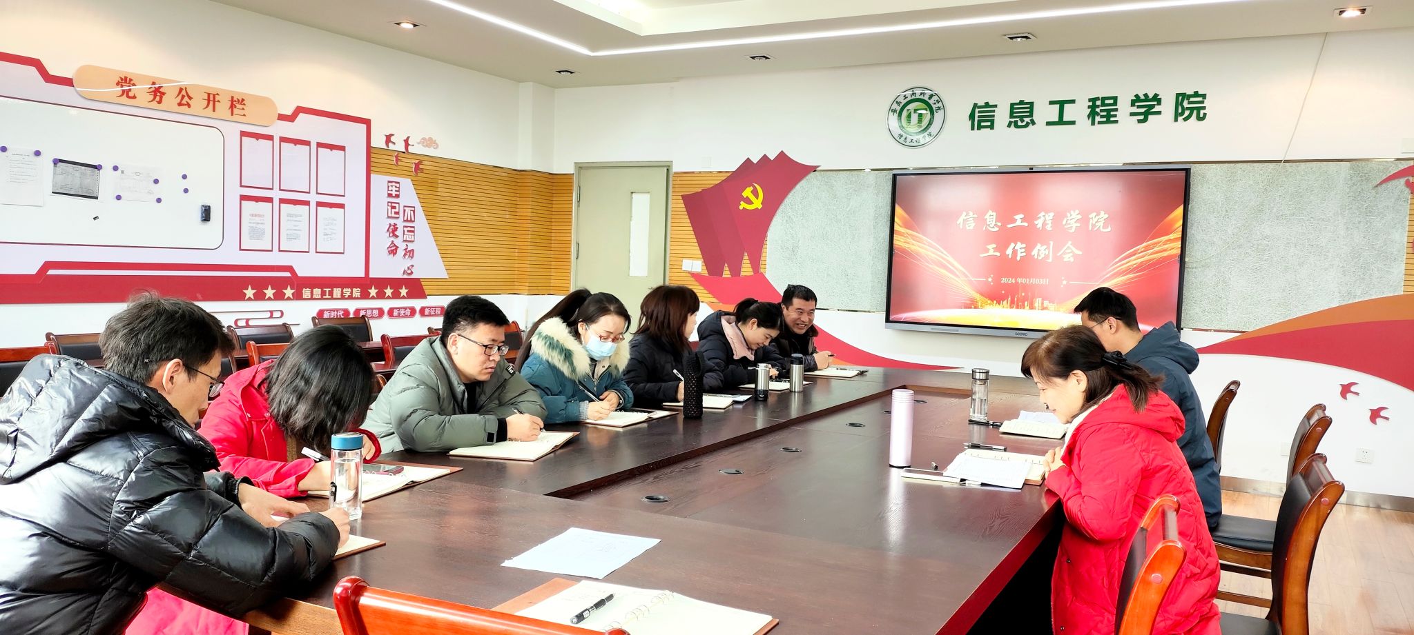 1月3日,信息工程学院在307活动室组织开展了2024年一月工作例会。此次会议就2024年专业调整、各专业招生计划数、分类招生大纲设定以及下学期授课安排等议题进行深入探讨和决策。